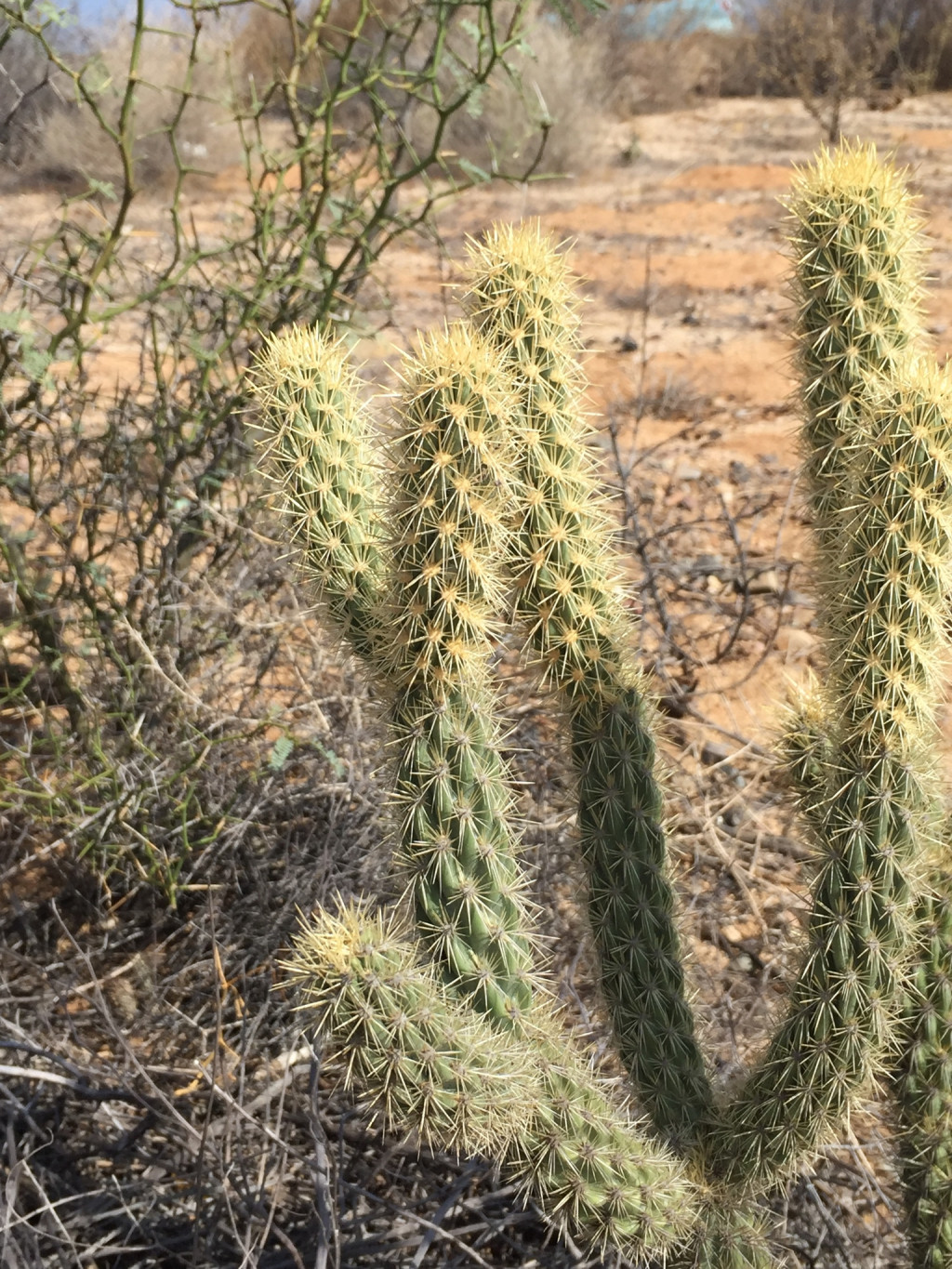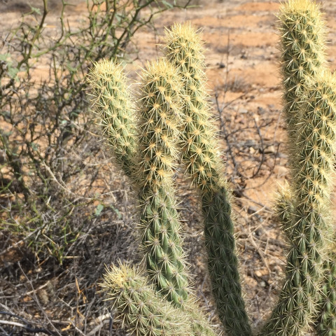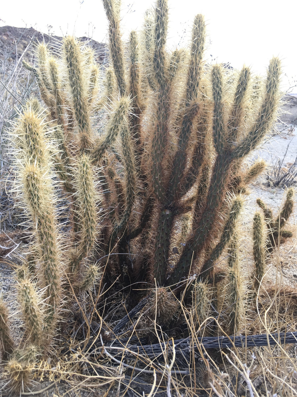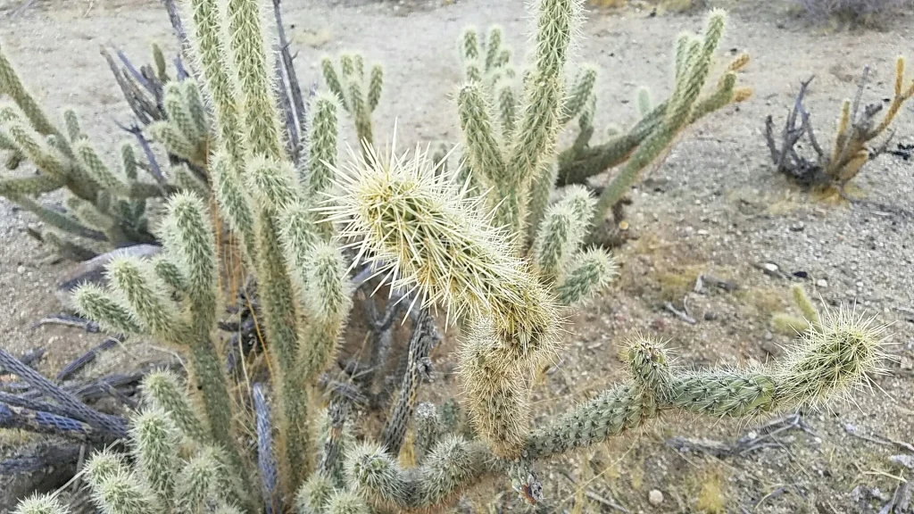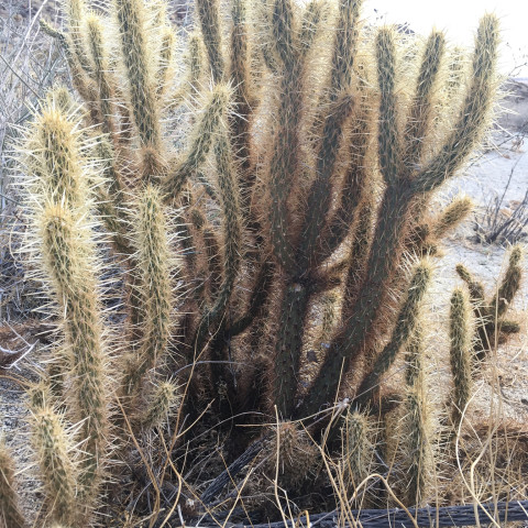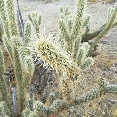 Cylindropuntia ganderi, Cylindropuntia cinsinin daha ince segmentli ve nispeten zarif görünümlü türlerinden biridir. Diğer birçok cholla türüne kıyasla daha az kalın ve daha uzun segmentler üretir. Bu segmentler genellikle dik veya hafif eğimli şekilde büyür ve zamanla dallanarak açık, hava alan bir form oluşturur. Bitki, yoğun ve kompakt bir yapıdan ziyade daha seyrek, dallı ve doğal bir çöl formu sergiler. Segment yüzeyi yeşil tonlarında olup, belirgin areoller ile kaplıdır. Bu areollerden çıkan dikenler orta yoğunlukta ve genellikle açık sarıdan krem tonlarına kadar değişen renktedir. Dikenler, bazı diğer Cylindropuntia türlerine göre daha ince ve nispeten daha az agresif görünse de yine de oldukça keskindir ve temas halinde kolayca deriye saplanabilir. Bu türün dikkat çeken özelliklerinden biri, segmentlerin nispeten ince ve uzun olmasıdır. Bu yapı, bitkinin daha hafif ve esnek bir görünüm kazanmasını sağlar. Aynı zamanda bu ince yapı, rüzgârlı ve açık alanlarda esnek hareket ederek kırılma riskini azaltan bir adaptasyon olarak düşünülebilir.