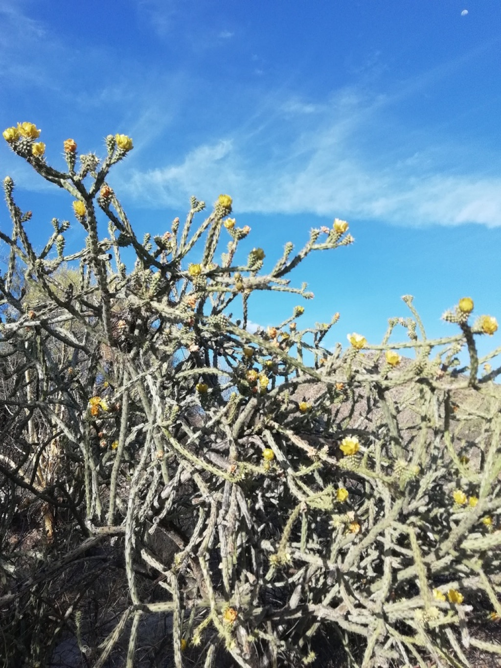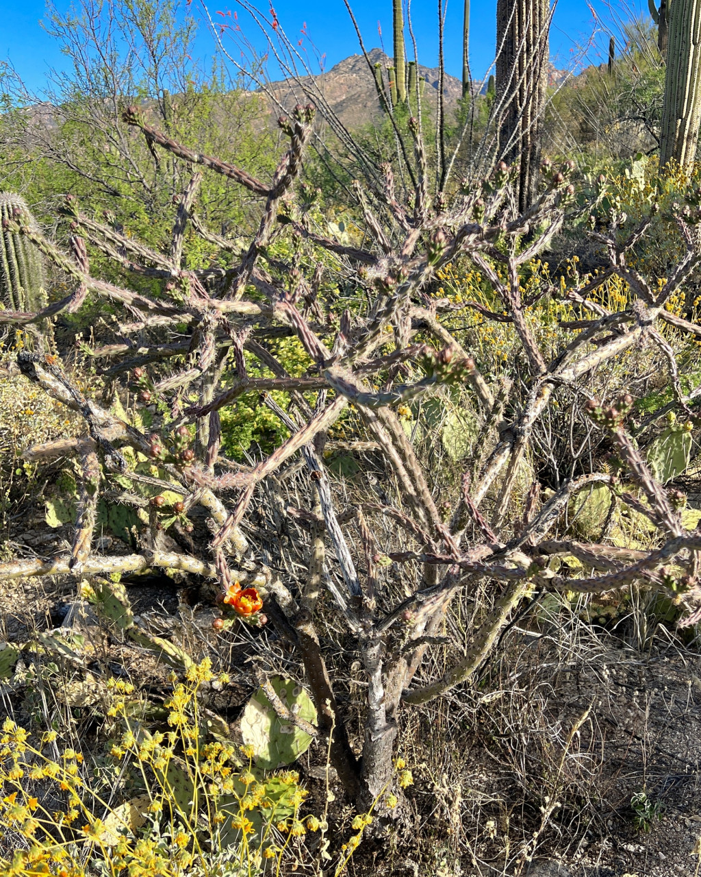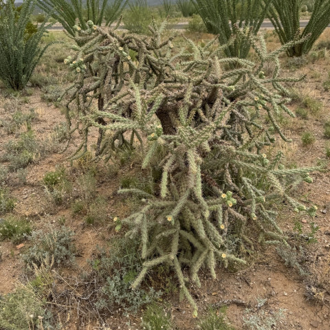 Cylindropuntia thurberi, Cactaceae familyasında yer alan ve özellikle Amerika’nın güneybatı çöl bölgelerinde yayılım gösteren bir kaktüs türüdür. “Desert cholla” olarak da bilinen bu tür, diğer Cylindropuntia üyelerine kıyasla daha belirgin ağaçsı formu ile öne çıkar. Zamanla odunsu bir ana gövde geliştirir ve yukarı doğru dallanan yapısı sayesinde küçük ağaç görünümü kazanır. Dallanma genellikle gövde boyunca düzenli aralıklarla oluşur ve segmentler çoğunlukla dışa doğru yayılır. Bu yapı, bitkinin hem ışık alımını optimize eder hem de çöl koşullarında stabil bir form oluşturmasını sağlar.