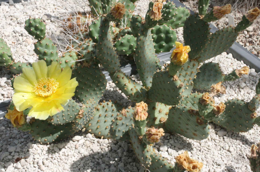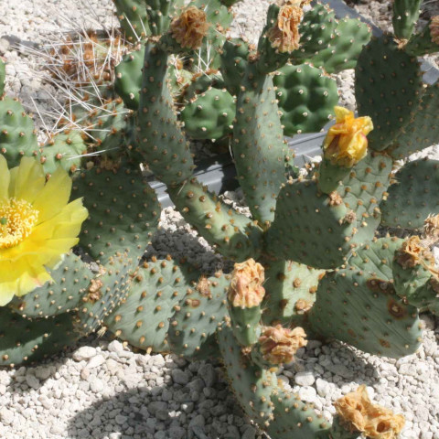 Opuntia aurea, küçük ve yassı gövde parçalarıyla büyüyen, sarı çiçekleriyle tanınan dayanıklı bir kaktüs türüdür. Doğal olarak kurak ve açık alanlarda, özellikle kumlu ya da taşlık zeminlerde görülür. Bu tür, sıcak ve güneşli ortamlara uyum sağlamıştır. Klasik yaprakları yoktur. Yeşil, oval ya da hafif yuvarlak görünen bölümler aslında su depolayan gövdesidir. Bu gövde parçaları kalın ve etlidir. İçlerinde su tutarak bitkinin uzun süre susuz kalmasını sağlar. Renkleri genellikle açık yeşil ile griye yakın yeşil tonlar arasında değişir. Gövde üzerinde küçük noktalar bulunur ve bu noktalardan kısa ya da orta uzunlukta dikenler çıkar. Bazı bitkilerde dikenler seyrek olabilir. Ayrıca çok küçük ve ele kolayca batan ince dikenler de bulunabilir. Bu nedenle bakım sırasında eldiven kullanılması önerilir. Opuntia aurea genellikle alçak ve yayvan büyür. Yerden fazla yükselmeden yanlara doğru genişleyebilir. Bu özelliği sayesinde doğal ortamında yere yakın kümeler oluşturur. Genellikle ilkbahar sonu ve yaz başında parlak sarı çiçekler açar. Çiçekler oldukça canlı ve dikkat çekicidir. Ortaları daha koyu tonlarda olabilir. Çiçekler gövde parçalarının uç kısmından çıkar. Yeterli güneş alan ve sağlıklı büyüyen bitkilerde çiçeklenme daha yoğun olur. Çiçeklenmeden sonra küçük meyveler oluşabilir. Bu meyveler zamanla olgunlaşır ve içinde tohum bulunur.