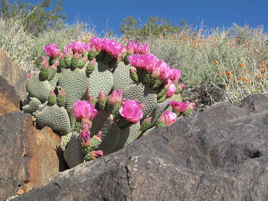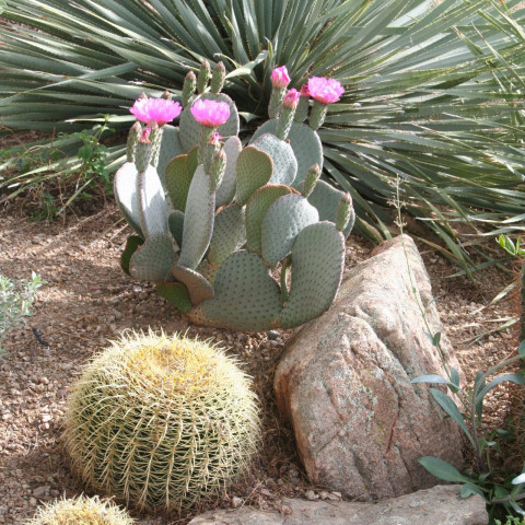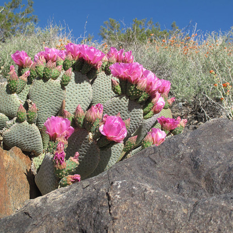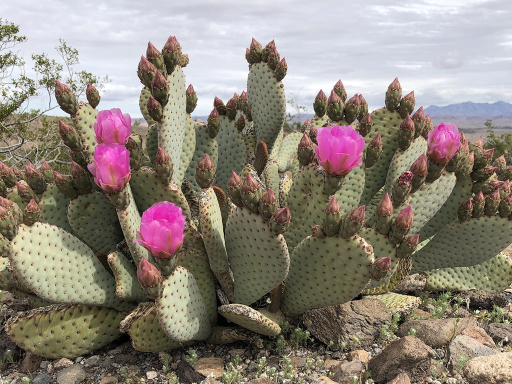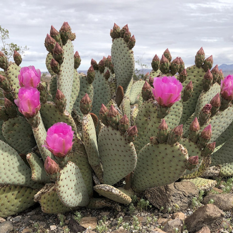 Opuntia basilaris, görüntüsüyle diğer birçok dikenli kaktüsten kolayca ayrılan özel bir türdür. En belirgin özelliği griye çalan açık yeşil gövde rengi ve canlı pembe çiçekleridir. Doğal olarak Amerika’nın kurak ve taşlı bölgelerinde, özellikle çöl alanlarında yetişir. Yere yakın büyür ve zamanla geniş bir alanı kaplayan sık kümeler oluşturur. Uzaktan bakıldığında yere serilmiş yuvarlak yastıklar gibi görünür. Bu bitkide klasik yapraklar yoktur. Gördüğümüz yassı ve yuvarlak parçalar su depolayan gövdelerdir. Bu parçalar genellikle yuvarlağa yakın, hafif oval şekildedir. Rengi mat gri, maviye çalan gri ya da açık yeşil olabilir. Bu soluk renk aslında güneşe dayanıklılığın bir göstergesidir. Gövde yüzeyinde küçük noktalar bulunur. Bu noktalardan çok ince ve kısa dikenler çıkar. Diğer bazı Opuntia türlerinin aksine, Opuntia basilaris’te uzun ve sert dikenler genellikle yoktur ya da çok azdır. Ancak yüzeydeki küçük ve neredeyse görünmeyen ince dikenler cilde temas ettiğinde rahatsız edebilir, bu nedenle dikkatli olunmalıdır.