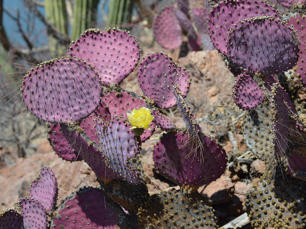 Opuntia gosseliniana’da yaprak olarak algılanan yapılar aslında yassı gövde segmentleridir. Bu segmentler oval veya eliptik formda olabilir ve kalın etli bir dokudan oluşur. Segmentlerin en dikkat çekici özelliği renkleridir. Çoğu bireyde segmentler gri-yeşil tonlarında görülürken, güçlü güneş ışığı veya düşük sıcaklık gibi çevresel koşullara bağlı olarak mor, mavi-mor ya da lavanta tonlarına dönebilir. Bu renk değişimi bitkinin en ayırt edici özelliklerinden biridir. Segment yüzeyinde areol adı verilen küçük noktalar bulunur ve bu yapılardan kısa dikenler gelişebilir. Dikenler çoğunlukla sarı veya açık kahverengi tonlarında olabilir. Bazı areollerde glochid olarak bilinen çok ince mikro dikenler de bulunur. Segmentler büyüme döneminde üst üste gelişerek bitkinin geniş bir alan kaplamasına olanak tanır. Opuntia gosseliniana yüksek ışık isteyen bir kaktüs türüdür. Doğal habitatında gün boyunca güçlü güneş ışığına maruz kalır. Bu nedenle yetiştirme sırasında da güneş alan ve aydınlık ortamlar tercih edilmelidir. Açık alanlarda doğrudan güneş ışığı bitkinin sağlıklı gelişimini destekler ve segmentlerde görülen mor tonların belirginleşmesine yardımcı olabilir. Yeterli ışık alan bitkiler daha kompakt ve güçlü segmentler oluşturur. Düşük ışık koşullarında segmentler uzayabilir ve bitkinin genel formu zayıflayabilir. İç mekânda yetiştirilecekse en aydınlık pencere önü tercih edilmelidir. Bu tür sıcak iklimlere uyumludur ve yüksek sıcaklıklara dayanıklıdır. Ancak uzun süreli nemli ortamlar bitkinin gelişimi açısından uygun değildir.