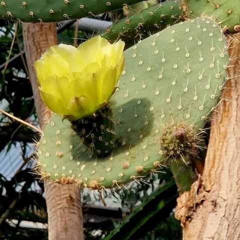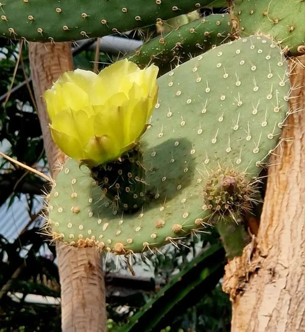 Opuntia leucotricha, Cactaceae familyasına ait olan ve Opuntia cinsinin en dikkat çekici türlerinden biridir. Bu tür özellikle Meksika’nın merkez ve kuzey bölgelerinde doğal olarak yayılış gösterir. Kurak ve yarı kurak iklimlerde gelişen bu kaktüs, çalılık alanlar, taşlık araziler ve yarı çöl bölgelerinde görülür. Opuntia leucotricha diğer birçok Opuntia türünden farklı olarak ağaç formuna yaklaşabilen bir büyüme yapısına sahiptir. Doğal habitatında zamanla kalın bir gövde geliştirerek 3–5 metre yüksekliğe kadar ulaşabilir. Opuntia leucotricha’nın en ayırt edici özelliklerinden biri gövde ve segmentleri kaplayan beyaz, ince ve yoğun kıllı dikenlerdir. Tür adı olan leucotricha Yunanca kökenlidir ve “beyaz tüylü” anlamına gelir. Bu isim bitkinin karakteristik diken yapısına doğrudan gönderme yapar. Yaprak gibi görünen kısımlar aslında etli gövde segmentleridir. Bu segmentler genellikle oval veya eliptik formda olup kalın ve su depolayan bir yapıya sahiptir. Segmentlerin rengi çoğunlukla açık yeşil ile griye çalan yeşil tonları arasında değişebilir. Opuntia leucotricha’da dikenler çoğu zaman beyaz veya açık sarı renkli ince lifli yapılar şeklinde görülür.