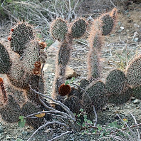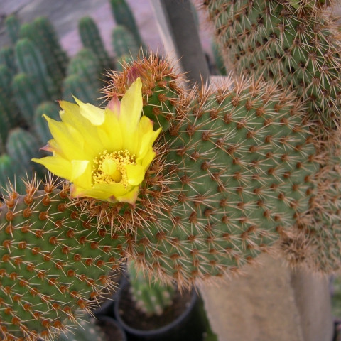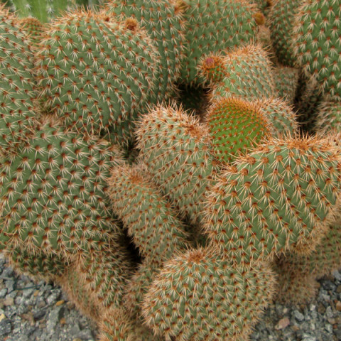 Opuntia pycnantha, Cactaceae familyasında yer alan ve Opuntia cinsine ait dikenli kaktüs türlerinden biridir. Bu tür özellikle Meksika’nın kurak ve yarı kurak bölgelerinde doğal olarak yetişir. Doğal habitatında kayalık yamaçlarda, çöl çalılıklarında ve güneş alan açık arazilerde gelişir. Tür adı olan pycnantha, Yunanca kökenlidir ve “yoğun çiçekli” anlamına gelir. Bu isim bitkinin çiçeklenme döneminde oluşturduğu yoğun tomurcuk ve çiçek kümelerine gönderme yapar. Opuntia pycnantha genellikle kompakt ve yere yakın büyüyen bir gelişim formuna sahiptir. Bitki zamanla yeni segmentler oluşturarak küçük kümeler meydana getirebilir. Segmentler çoğunlukla küçük veya orta boyutlu, oval veya yuvarlak formdadır. Renkleri açık yeşilden griye çalan yeşil tonlarına kadar değişebilir. Segment yüzeyinde areol adı verilen küçük çıkıntılar bulunur ve bu yapılardan dikenler gelişir.