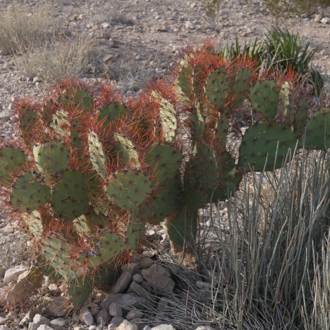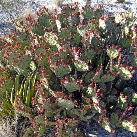 Opuntia spinosibacca, Opuntia cinsinin özellikle yoğun ve kırmızımsı dikenleri ile dikkat çeken türlerinden biridir. Bu tür, tipik dikenli armut kaktüslerinde olduğu gibi yassı ve etli segmentlerden oluşur. Segmentler su depolayan dokular olup bitkinin kurak ortamlarda uzun süre hayatta kalmasına yardımcı olur. Opuntia spinosibacca genellikle açık yeşil veya griye yakın yeşil renkte segmentler geliştirir. Segmentler oval ya da yuvarlağa yakın formda olabilir ve bitki çoğu zaman yere yakın büyüyen yoğun kümeler oluşturur.