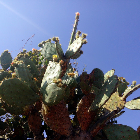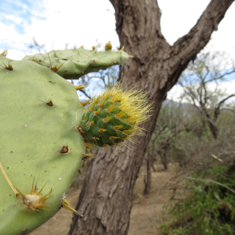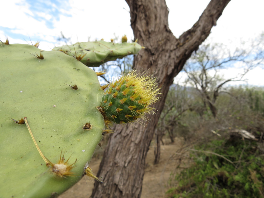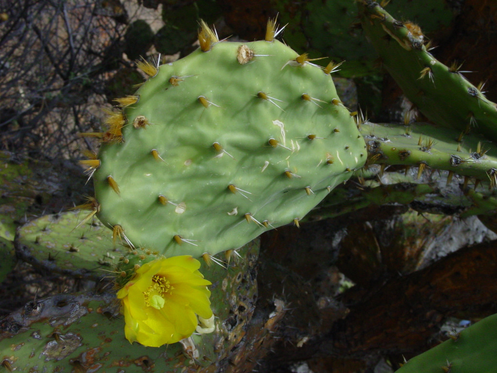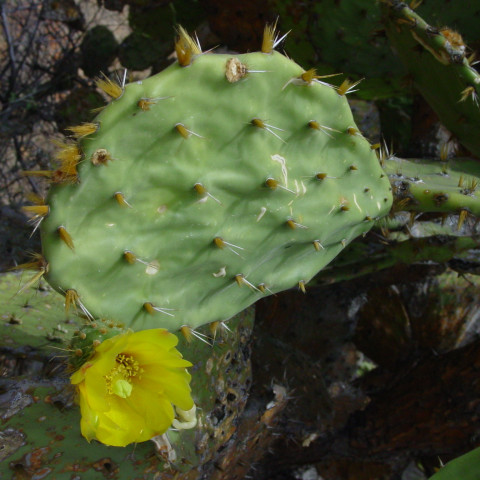 Opuntia velutina, Opuntia cinsinin dikkat çekici dikenli armut türlerinden biridir ve özellikle kadifemsi yüzey dokusu ile tanınır. Bu kaktüs, tipik Opuntia türlerinde olduğu gibi yassı ve etli segmentlerden oluşur. Segmentler su depolayan fotosentetik dokulardır ve bitkinin kurak ortamlarda uzun süre hayatta kalmasını sağlar. Opuntia velutina genellikle açık yeşil veya griye yakın yeşil tonlarında segmentler geliştirir ve uygun koşullarda geniş kümeler halinde büyüyebilir. Bitkinin segment yüzeyinde düzenli aralıklarla yerleşmiş areoller bulunur. Areoller Opuntia cinsinin karakteristik yapılarıdır ve dikenlerin, sürgünlerin ve çiçeklerin geliştiği merkezlerdir. Opuntia velutina’da bu areollerden ince ve çoğunlukla sarımsı tonlarda dikenler gelişebilir. Dikenlerin uzunluğu genellikle kısa ile orta boy arasında değişir. Areollerin çevresinde ayrıca çok küçük dikenler bulunur.