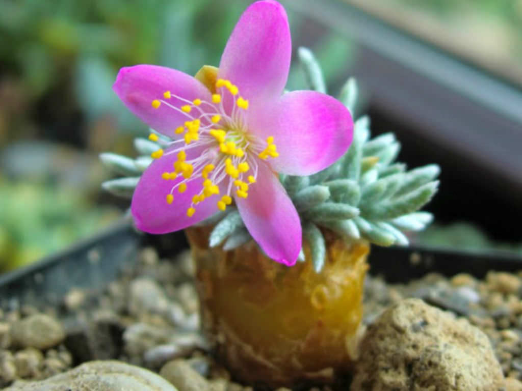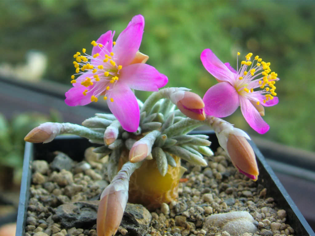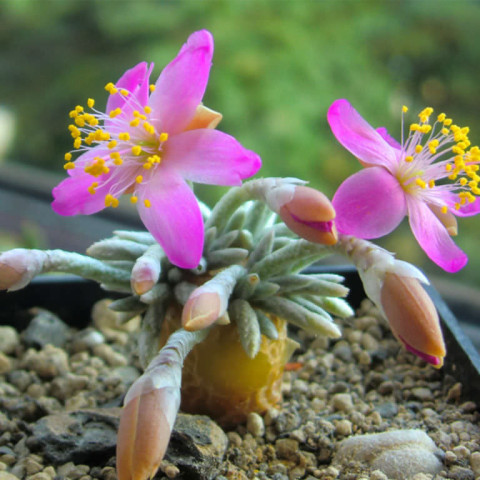 Çiçekleri ince saplar üzerinde gelişir ve çoğunlukla pembe tonlarda açar. Küçük gövde yapısına rağmen çiçeklenme döneminde oldukça zarif bir görünüm sunar. Sağlıklı kök sistemi, yeterli ışık ve dengeli bakım çiçeklenme potansiyelini artırır. Anacampseros quinaria, kalınlaşan gövdesi ve kompakt yaprak kümeleri ile özel koleksiyon türleri arasında yer alır.