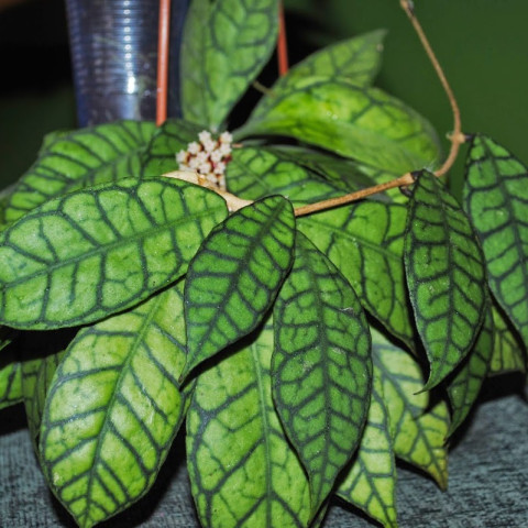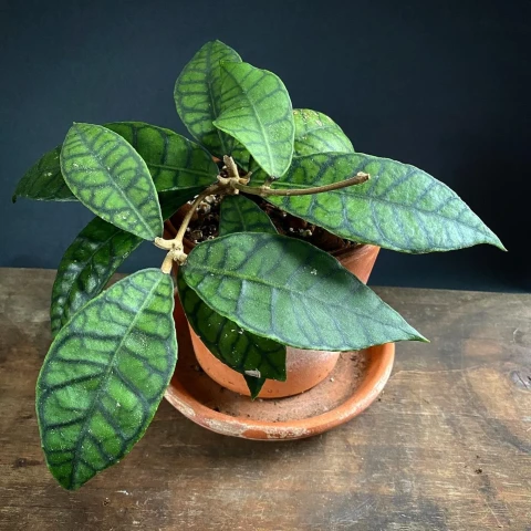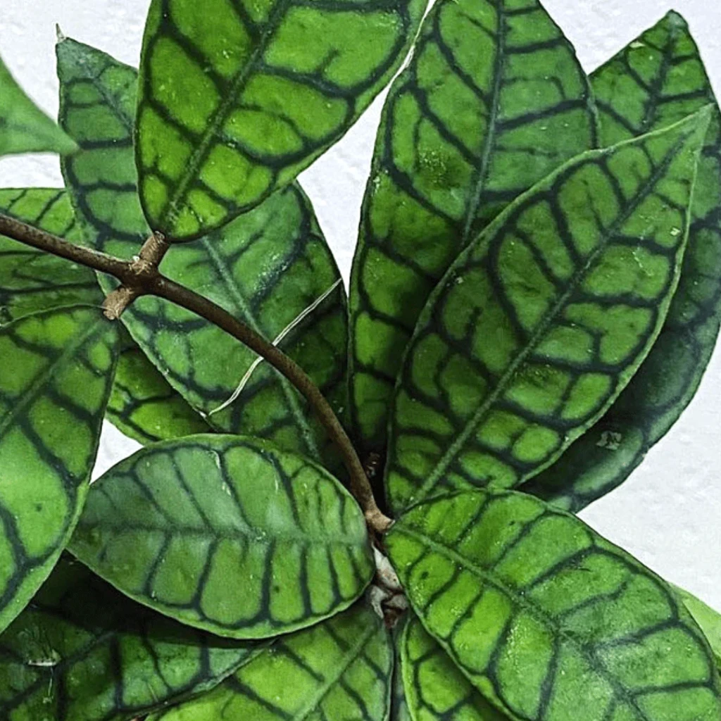 Hoya callistophylla, Apocynaceae familyasında yer alan Hoya cinsine ait, özellikle yaprak damar yapısı ile tanınan ayırt edici bir tropikal türdür. Doğal yayılış alanı Güneydoğu Asya olup, başta Borneo olmak üzere Malezya ve çevresindeki nemli tropikal orman ekosistemlerinde görülür. Doğada çoğunlukla epifitik yaşam biçimi sergiler ve ağaç gövdeleri ya da kalın dallar üzerinde tutunarak gelişir. Sarkıcı veya yarı sarılıcı formda yetiştirilebilir. Gövdeler orta kalınlıkta, esnek ve boğumlu yapıdadır; boğum noktalarından yeni sürgünler oluşturarak bitkinin zamanla genişlemesini sağlar. Hoya callistophylla’nın yaprakları türün en karakteristik özelliğini oluşturur. Yapraklar büyük, kalın, etli ve eliptik formdadır. Yaprak yüzeyinde belirgin şekilde kabartılı görünen koyu renkli damarlar bulunur. Bu damarlar açık yeşil zemin üzerinde kontrast oluşturarak ağ benzeri bir desen meydana getirir. Yaprak dokusu sert ve dayanıklıdır. Yaprak yüzeyi genellikle mat veya hafif yarı parlak görünüm sergiler. Yapraklar gövde üzerinde karşılıklı dizilir. Yeterli ışık koşullarında yaprak damarları daha belirgin hâle gelirken, düşük ışık seviyelerinde bu kontrast zayıflayabilir.