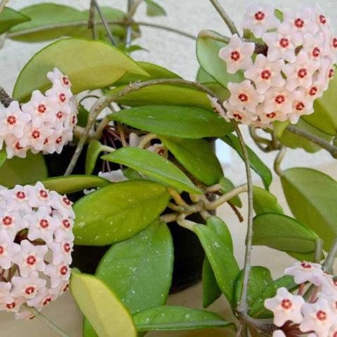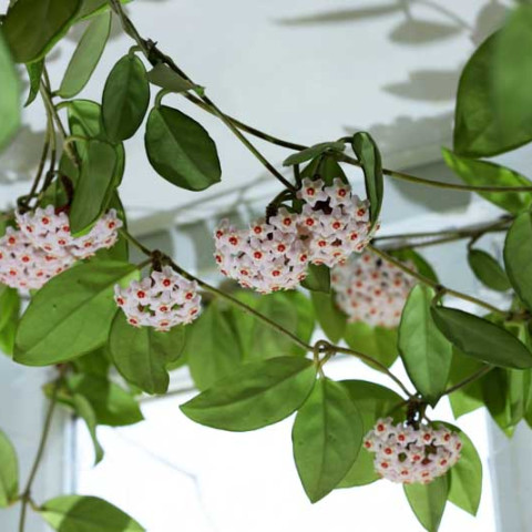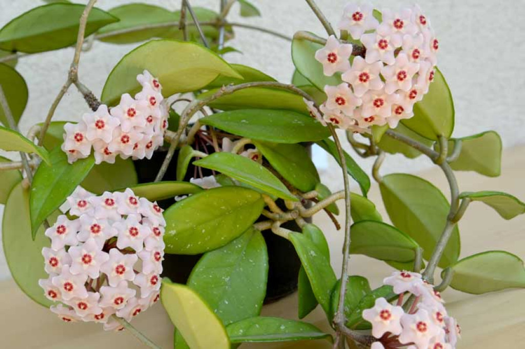 Hoya carnosa’nın çiçekleri, türün en ayırt edici özelliklerinden biridir. Çiçekler şemsiye formunda, yoğun ve simetrik salkımlar halinde açar. Her bir çiçek yıldız biçimlidir ve balmumsu bir dokuya sahiptir. Taç yapraklar genellikle açık pembe ile beyaz tonları arasında değişir. Merkezde yer alan yapısı koyu pembe ya da kırmızımsı renktedir. Çiçek yüzeyi hafif tüylü bir doku gösterebilir. Çiçeklenme uygun koşullarda düzenli olarak tekrarlanabilir. Eski çiçek sapları korunmalıdır; çünkü Hoya carnosa yeni çiçeklerini çoğunlukla aynı saplar üzerinden oluşturur. Çoğaltma işlemleri en yaygın olarak gövde çeliği ile yapılır. Çeliklerde en az bir veya iki boğum bulunması yeterlidir. Kesim sonrası kesik yüzeyin kısa süre bekletilerek kuruması, çürüme riskini azaltır. Köklendirme sürecinde ortam hafif nemli tutulur, ancak aşırı sulamadan kaçınılır. Gübreleme yalnızca aktif büyüme dönemlerinde ve düşük dozlarda uygulanmalıdır. Aşırı besin uygulamaları, doku yapısının zayıflamasına ve düzensiz gelişime neden olabileceğinden tercih edilmez.