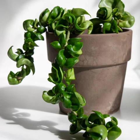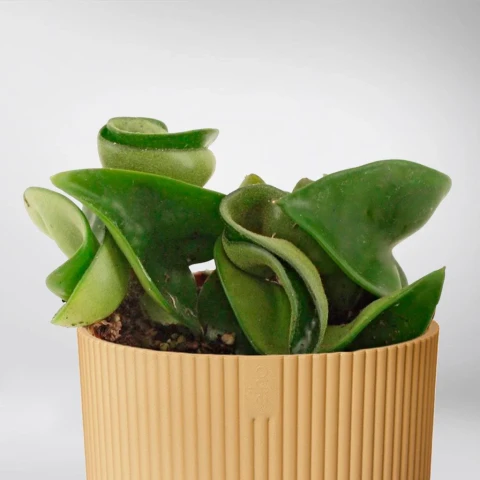 Hoya carnosa ‘Compacta’, Apocynaceae familyası içinde yer alan Hoya cinsine ait, Hoya carnosa türünün morfolojik olarak farklılaşmış bir kültivarıdır. “Compacta” adı, bitkinin belirgin şekilde kıvrımlı ve yoğun yaprak dizilimine atıfta bulunur. Doğal bir varyasyon sonucu ortaya çıkmış olup Güneydoğu Asya kökenli Hoya carnosa’nın epifitik karakterini taşır. Doğal ortamında ağaç gövdeleri ve dalları üzerinde gelişen bu tür, kültür ortamında genellikle askılı saksılarda sarkıcı formda yetiştirilir. Büyüme hızı klasik Hoya carnosa formlarına kıyasla daha yavaştır ve bu durum bitkinin bakım ritmini de etkiler. Hoya carnosa ‘Compacta’nın gövdeleri kalın, etli ve boğumlu yapıdadır. Gövdeler, yoğun kıvrımlı yaprak dizilimi nedeniyle dışarıdan bakıldığında düzensiz ve burgu şeklinde bir görünüm sergiler. Boğum araları oldukça kısadır ve yeni sürgünler genellikle mevcut kıvrımların arasından çıkar. Genç sürgünler açık yeşil tonlarda ve nispeten yumuşak dokuluyken, zamanla sertleşir ve koyu yeşil renge döner. Gövde dokusu suyu sınırlı ölçüde depolayabilir; ancak uzun süreli ıslaklığa karşı hassastır. Bu nedenle bitkinin genel yapısı, iyi hava dolaşımı ve kontrollü sulama gerektirir. Yapraklar, Hoya carnosa ‘Compacta’nın en ayırt edici morfolojik unsurudur. Yapraklar kalın, etli ve belirgin şekilde kıvrılmıştır. Yapraklar kendi ekseni etrafında bükülerek zincir veya halat benzeri bir yapı oluşturur. Yaprak dizilimi son derece sıkıdır ve gövdeyi büyük ölçüde kaplar. Yaprak yüzeyi pürüzsüzdür ve yoğun mumsu bir tabaka ile kaplıdır. Yaprak rengi genellikle koyu yeşildir; bazı bireylerde daha açık yeşil tonlar görülebilir. Bu yoğun ve kapalı yaprak dizilimi, bitkinin nem tutma kapasitesini artırırken, aynı zamanda yaprak aralarında hava sirkülasyonunun azalmasına da neden olabilir.