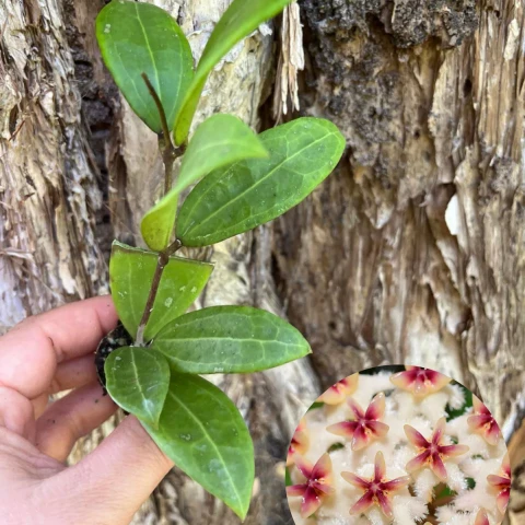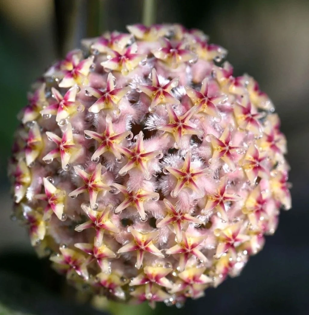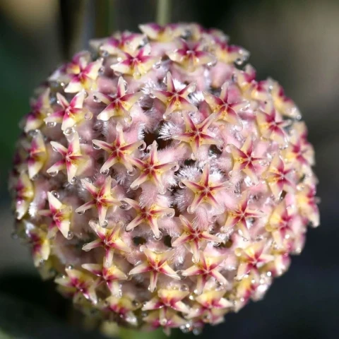 Bu türün en dikkat çekici özelliği çiçekleridir. Çiçekler, şemsiye formunda yoğun salkımlar halinde gelişir. Her bir çiçek yıldız biçimlidir ve belirgin bir renk kontrastı sergiler. Taç yaprakların dış kısmı beyaz, açık pembe ve yoğun tüylü bir dokuya sahiptir. Merkezde yer alan yapısı ise koyu pembe ile kırmızı tonlarındadır. Bu renk geçişi, çiçeklere güçlü bir görsel etki kazandırır. Çiçek yüzeyi balmumsu yapıdadır. Çiçeklenme süresi, ortam koşullarına bağlı olarak birkaç gün ile bir haftayı aşabilir. Tomurcuklanma döneminde ani sıcaklık, ışık veya konum değişiklikleri çiçek dökümüne yol açabilir. Çoğaltma işlemleri genellikle gövde çeliği yöntemiyle gerçekleştirilir. Çeliklerde en az bir veya iki boğum bulunması tercih edilir. Kesim sonrası kesik yüzeyin kısa süre bekletilerek kuruması, çürüme riskini azaltır. Köklendirme sürecinde ortam hafif nemli tutulur, ancak aşırı sulamadan kaçınılır. Gübreleme yalnızca aktif büyüme dönemlerinde ve düşük dozlarda uygulanmalıdır. Aşırı besin uygulamaları, dokuların zayıflamasına ve dengesiz gelişime neden olabileceğinden kaçınılması gerekir.