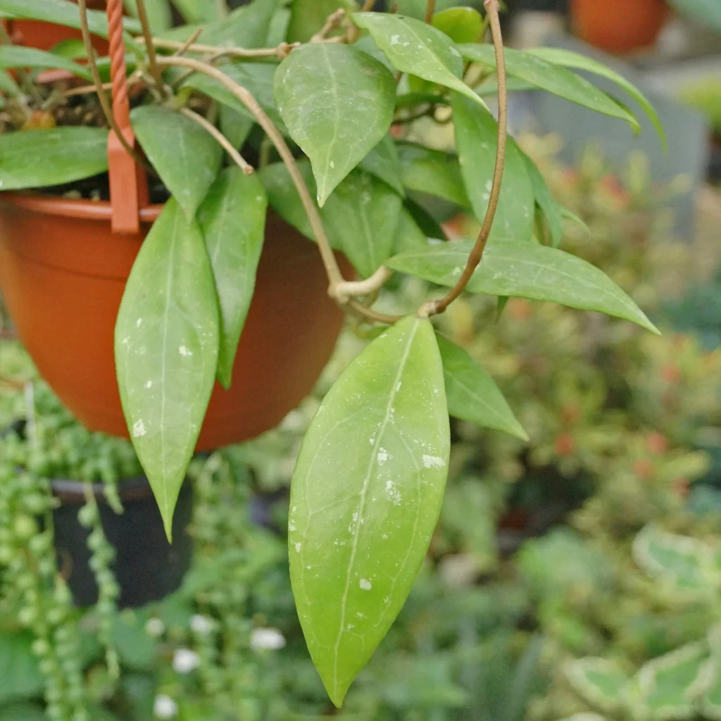 Hoya erythrostemma, Apocynaceae familyası içerisinde yer alan Hoya cinsine ait, çiçek yapısı ve renk kontrastı ile ayırt edilen epifitik bir türdür. Doğal yayılış alanı Güneydoğu Asya’nın tropikal ve yarı tropikal bölgeleridir. Doğada çoğunlukla ağaç gövdelerine tutunarak veya kaya yüzeylerinde gelişir. Bu yaşam biçimi, kök yapısının hava sirkülasyonuna açık, hızlı kuruyan ortamlara uyum sağlamasına neden olmuştur. Hoya erythrostemma’nın yaprakları orta büyüklükte, eliptik ile oval form arasında değişen bir yapı gösterir. Yapraklar etli dokudadır ancak aşırı kalın değildir. Yüzeyleri pürüzsüzdür ve hafif parlak bir görünüme sahiptir. Yaprak rengi genellikle orta ile koyu yeşil tonları arasındadır. Sağlıklı gelişim gösteren bireylerde yapraklar sert, dolgun ve simetrik bir dizilim sergiler. Yetersiz ışık koşullarında boğum araları uzayabilir ve yapraklar daha ince formda gelişebilir.