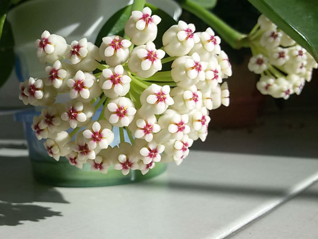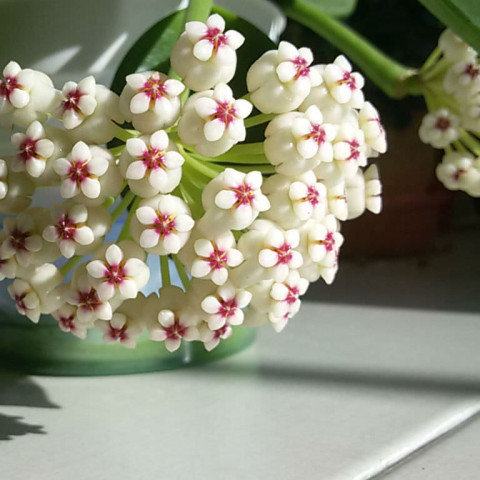 Hoya pachyclada ‘Red Corona’, çiçeklenme özellikleriyle Hoya cinsi içinde oldukça dikkat çeken bir kültivardır. Çiçekler şemsiye formunda, sık ve düzenli salkımlar halinde gelişir. Yıldız biçimli çiçeklerin taç yaprakları genellikle açık krem veya beyaz tonlarındadır. Çiçeğin merkez kısmında yer alan korona yapısı ise adını aldığı şekilde kırmızı veya koyu bordo tonlarındadır ve güçlü bir görsel kontrast oluşturur. Çiçek yüzeyi yoğun mumsu yapıdadır. Çiçeklenme sırasında nektar salgılanabilir. Çiçek oluşumu, yeterli ışık, dengeli sulama ve bitkinin genel sağlığı ile doğrudan ilişkilidir. Sık yer değişimi ve bakım koşullarındaki ani değişimler tomurcuk dökümüne neden olabilir. Çoğaltma işlemleri genellikle gövde çeliği ile gerçekleştirilir. En az bir boğum içeren sağlıklı bir sürgün kesilerek alınır ve kesik yüzeyin kısa süre kuruması beklenir. Ardından geçirgen bir karışımda köklendirme yapılır. Köklendirme sürecinde aşırı sulamadan kaçınılmalıdır. Gübreleme uygulamaları yalnızca ilkbahar döneminde ve düşük dozlarda yapılmalıdır. Dengeli içerikli, düşük azot oranına sahip besinler tercih edilmelidir. Bu bakım yaklaşımı, Hoya pachyclada ‘Red Corona’nın dengeli gelişimini, güçlü yaprak yapısını ve düzenli çiçeklenmesini destekler.