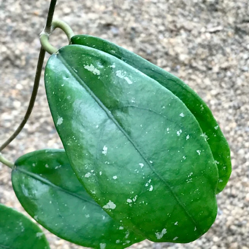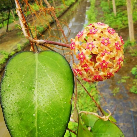 Hoya vitellina, Apocynaceae familyasında yer alan Hoya cinsine ait, epifitik gelişim gösteren bir türdür. Doğal yayılış alanı Güneydoğu Asya’dır ve doğada çoğunlukla ağaç gövdeleri üzerinde, yarı gölgeli ve havadar ortamlarda gelişir. Epifitik yaşam biçimi nedeniyle kök sistemi, sürekli nemli topraklara değil; kısa sürede kuruyan ve hava dolaşımı olan ortamlara uyum sağlamıştır. Hoya vitellina, özellikle iri ve kalın yaprakları ile yoğun renkli çiçek salkımları sayesinde Hoya cinsi içinde kolay ayırt edilebilen türler arasında yer alır. Hoya vitellina’nın yaprakları iri, geniş eliptik ile oval form arasında değişir. Yaprak dokusu oldukça kalın ve etlidir. Bu yapı, bitkinin su depolama kapasitesini artırır ve kısa süreli kuraklığa tolerans sağlamasına yardımcı olur. Yaprak yüzeyi pürüzsüzdür ve belirgin bir parlaklık gösterebilir. Yaprak rengi çoğunlukla orta ile koyu yeşil tonlarındadır. Yeterli ışık alan bireylerde yapraklar daha kompakt, kalın ve sert bir yapı kazanırken; düşük ışık koşullarında yapraklar daha ince gelişebilir ve boğum araları uzayabilir. Yapraklar gövde üzerinde karşılıklı dizilir ve sürgünler boyunca düzenli bir görünüm oluşturur.