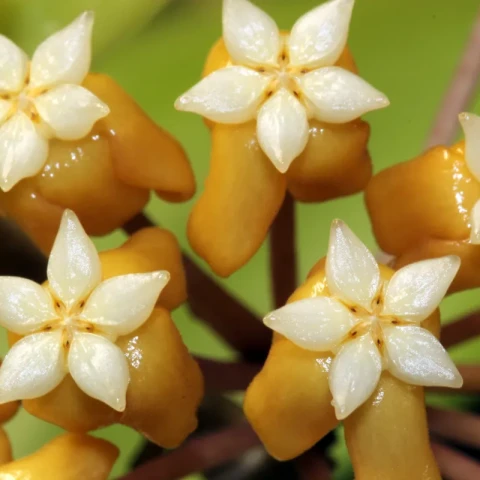 Hoya vitellina’nın çiçekleri, türün en dikkat çekici özelliklerinden biridir. Çiçekler şemsiye formunda, sık ve yuvarlak salkımlar halinde gelişir. Her salkımda çok sayıda küçük, yıldız biçimli çiçek bulunur. Çiçeklerin dış taç yaprakları genellikle sarıdan altın sarısına kadar değişen tonlardadır. Merkez kısımda ise beyaz ya da açık krem renkli, belirgin yıldız formu görülür. Çiçek yüzeyi balmumsu dokudadır ve salkım genelinde yoğun bir renk kontrastı dikkat çeker. Çiçeklenme, yeterli ışık alan, sağlıklı kök yapısına sahip ve dengeli büyüyen bitkilerde daha düzenli gözlemlenir. Tomurcuklanma döneminde ani ortam değişiklikleri çiçek dökümüne neden olabilir. Çoğaltma işlemleri genellikle gövde çeliği ile yapılır. Çeliklerde en az bir veya iki boğum bulunması tercih edilir. Kesim sonrası kesik yüzeyin kısa süre kurutulması, köklendirme sürecinde çürüme riskini azaltır. Köklendirme döneminde ortam nemli tutulur ancak aşırı sulamadan kaçınılır. Gübreleme uygulamaları yalnızca aktif büyüme dönemlerinde ve düşük dozlarda yapılmalıdır. Aşırı besin uygulamaları, yaprak dokusunda yumuşamaya ve dengesiz gelişime yol açabilir. Bu nedenle Hoya vitellina bakımında dengeli ve kontrollü bir yaklaşım benimsenmelidir.