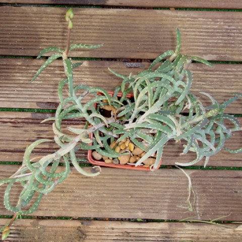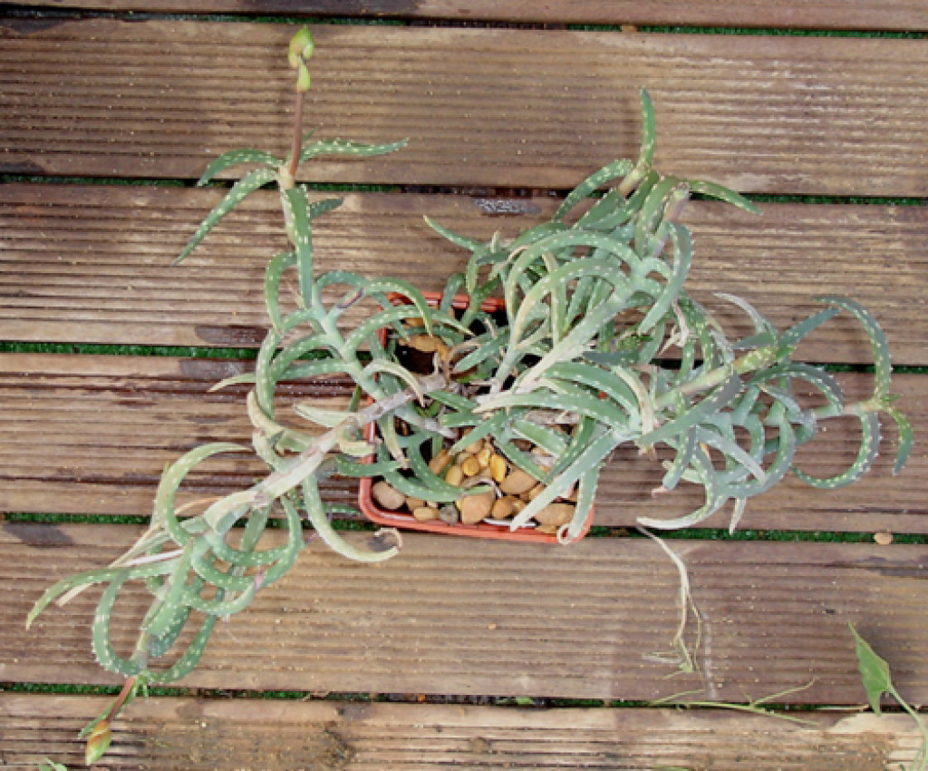 Aloe antandroi, Madagaskar kökenli Aloe türlerinden biri olup, doğal habitatında sıcak ve kurak koşullara uyum sağlamış sukulent bitkiler arasında yer alır. Bu tür, klasik rozet formundan ziyade daha çok gövde oluşturarak uzayan ve dallanma eğilimi gösterebilen yapısıyla dikkat çeker. Zamanla odunsu bir gövde geliştirebilir ve bu gövde üzerinden yeni sürgünler vererek çok dallı bir form oluşturur. Aloe antandroi’nin yaprakları uzun, dar ve hafif kıvrımlı bir yapıdadır. Yaprak yüzeyi genellikle düz ve parlak yeşil tonlardadır. Kenar hatları boyunca küçük, düzenli aralıklarla dizilmiş dişler bulunur. Bu dişler çoğunlukla açık renkli olup, bitkinin genel görünümüne belirgin bir kontrast kazandırır. Yapraklar, gövde boyunca daha seyrek dizilerek bitkiye daha açık ve yayvan bir görünüm verir.