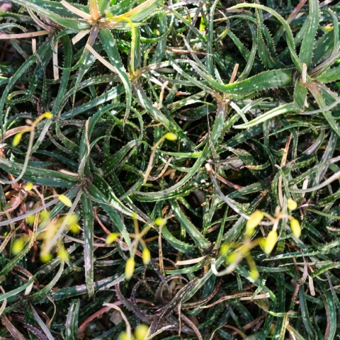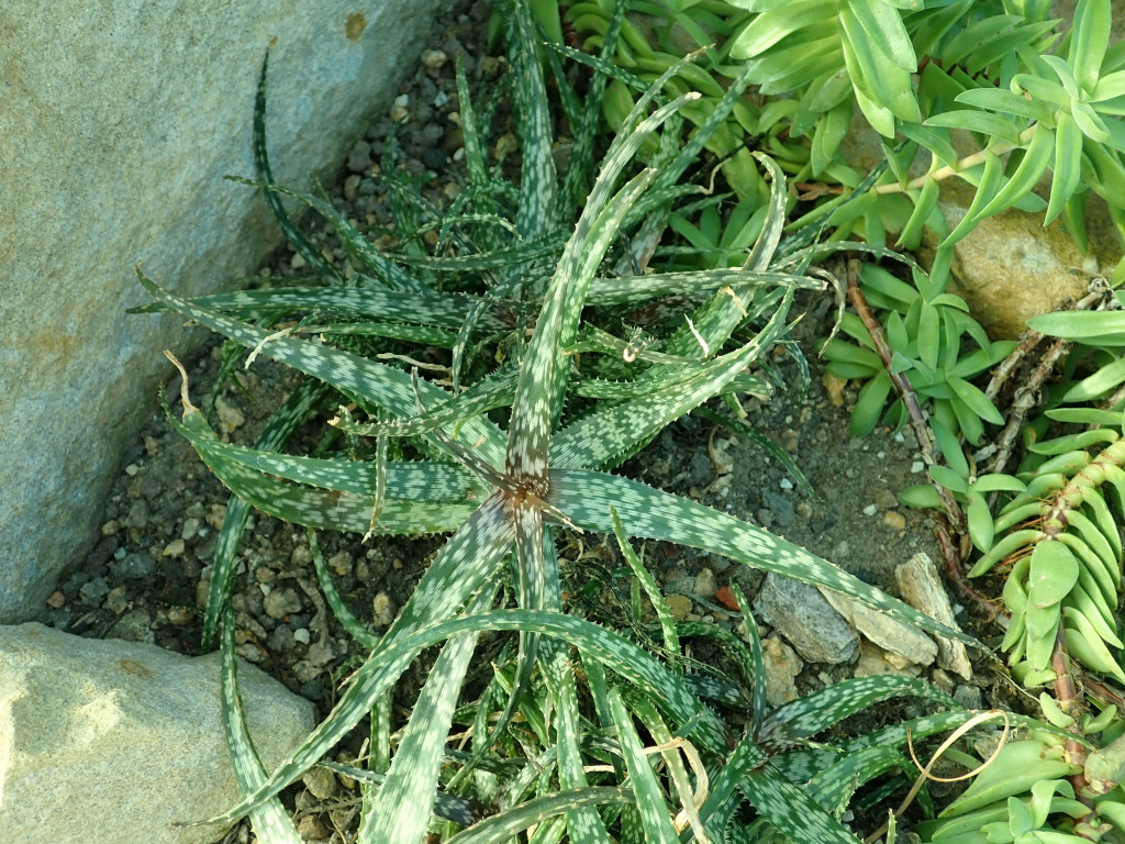 Aloe bakeri, Madagaskar kökenli, ince yapraklı ve yoğun benekli görünümü ile dikkat çeken Aloe türlerinden biridir. Bu tür, doğal olarak kurak ve yarı kurak bölgelerde, çoğunlukla taşlık ve iyi drenajlı zeminlerde gelişim gösterir. Aloe bakeri genellikle gövdesiz ya da çok kısa gövdeli bir yapıdadır ve yapraklar merkezden çıkan gevşek rozetler oluşturur. Zamanla yan sürgünler vererek yayılma eğilimi gösterebilir ve küçük koloniler oluşturabilir. Genel formu, diğer Aloe türlerine kıyasla daha açık ve dağınık bir rozet yapısına sahiptir.