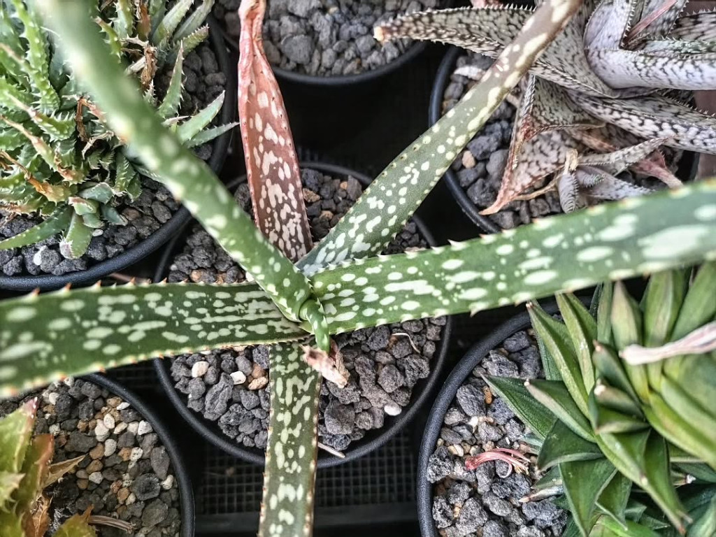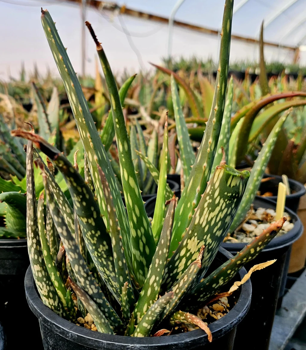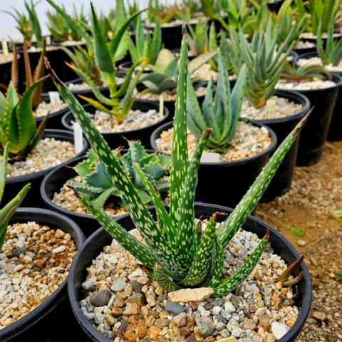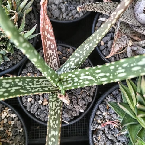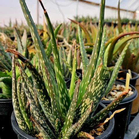Aloe bertemariae, Asphodelaceae familyasına ait ve Etiyopya kökenli olduğu bilinen, kompakt gelişim gösteren Aloe türlerinden biridir. Bu tür, küçük boyutlu yapısı ve belirgin benekli yaprak deseni ile dikkat çeker. Genellikle rozet formunda gelişir ve uygun koşullarda tabandan sürgün vererek kümelenme eğilimi gösterebilir. Doğal habitatında taşlık, iyi drene olan ve organik madde açısından fakir zeminlerde yetişir. Bu nedenle kültür ortamında da benzer koşulların sağlanması gelişim açısından önemlidir. Yaprak yapısı etli, dar ve sivri uçlu formdadır. Yapraklar rozet merkezinden dışa doğru düzenli şekilde dizilir. Yüzey, türün karakteristik özelliği olan açık renkli beneklerle kaplıdır. Bu benekler düzensiz şekilde dağılarak bitkiye dekoratif bir görünüm kazandırır. Yaprak kenarlarında küçük ve ince dişler bulunur. Renk tonları genellikle koyu yeşil ile gri-yeşil arasında değişir. Yüksek ışık altında yapraklarda hafif kızarıklık veya bronz tonlar görülebilirken, düşük ışık koşullarında desen belirginliği azalabilir ve yapraklar uzayabilir.
