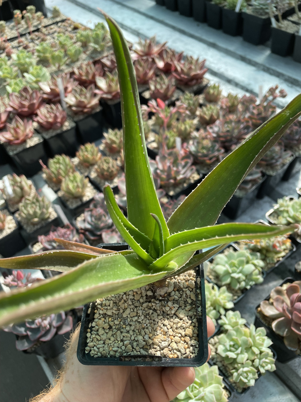 Aloe brachystachys, Asphodelaceae familyasına ait olup Doğu Afrika kökenli bir Aloe türüdür. Bu tür, kompakt gelişim formu ve kısa, yoğun çiçek salkımları ile ayırt edilir. Doğal ortamında genellikle kayalık ve geçirgen toprak yapısına sahip alanlarda, açık ve güneşli bölgelerde gelişim gösterir. Zamanla tabandan sürgün vererek kümelenme eğilimi gösterir ve yer örtücü karakter sergileyebilir. Yapraklar etli, kısa ve geniş mızraksı formdadır. Rozet yapısı belirgindir ve yapraklar merkezden dışa doğru sık dizilim gösterir. Yaprak yüzeyi genellikle mat yeşil tonlardadır ve bazı bireylerde yüzey boyunca hafif beneklenmeler görülebilir. Yaprak kenarlarında küçük, düzenli ve belirgin dişler bulunur. Bu dişler genellikle açık renkli ya da hafif kızıl tonlara sahip olabilir. Yaprak uçları sivridir ve kompakt rozet yapısı sayesinde bitki sıkı bir form oluşturur. Yüksek ışık altında yapraklarda hafif kızarma gözlemlenebilirken, düşük ışıkta yaprak rengi soluklaşabilir ve rozet formu gevşeyebilir.