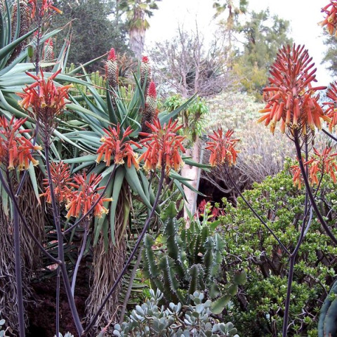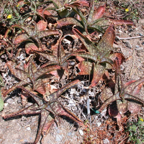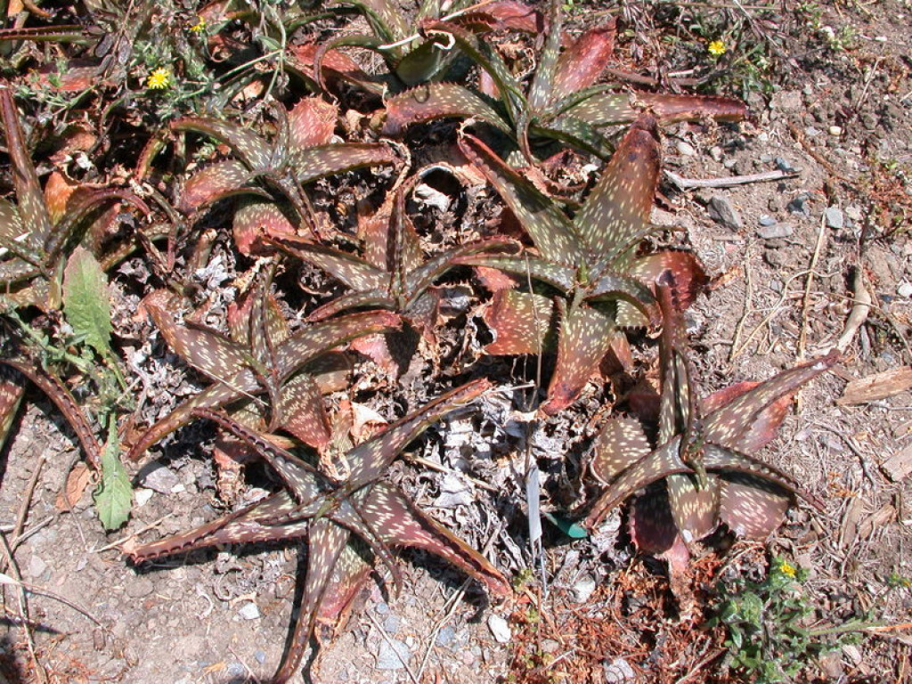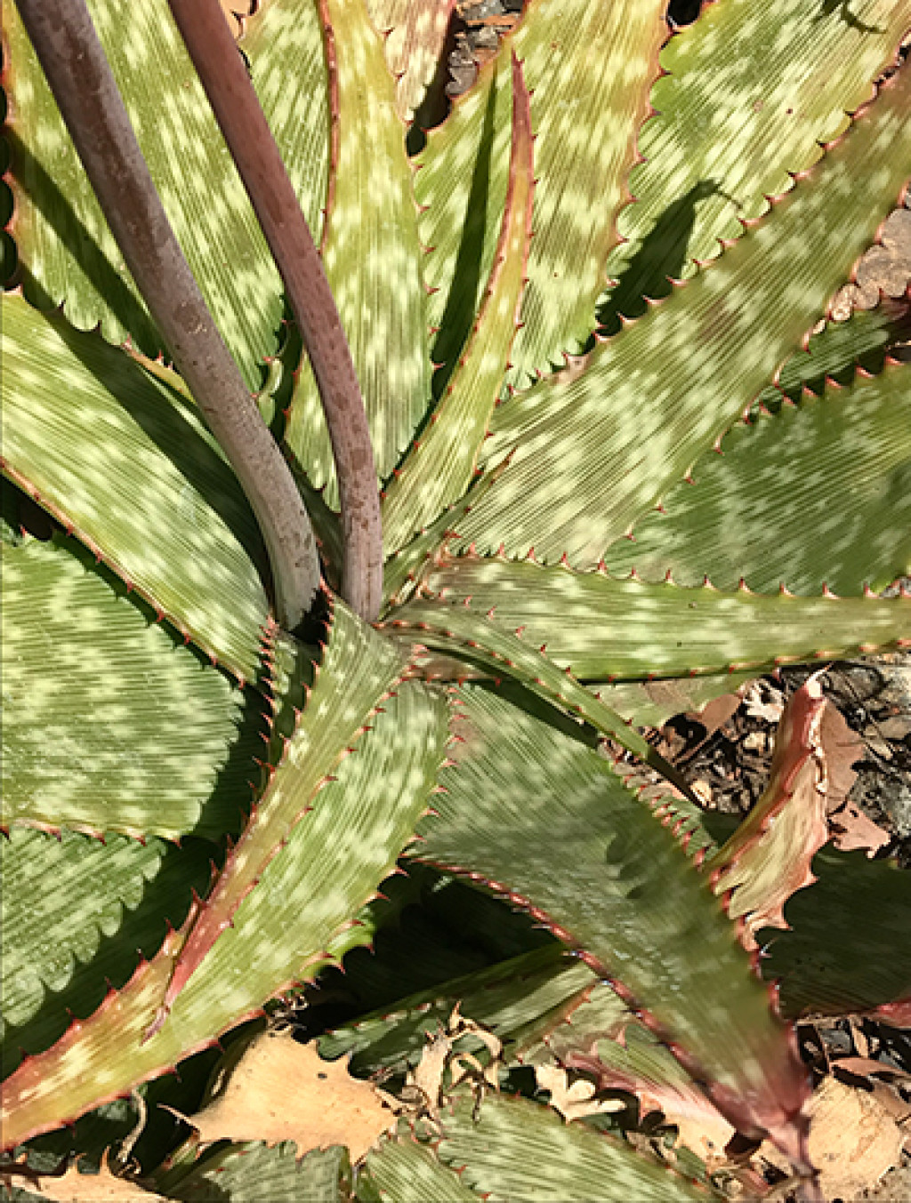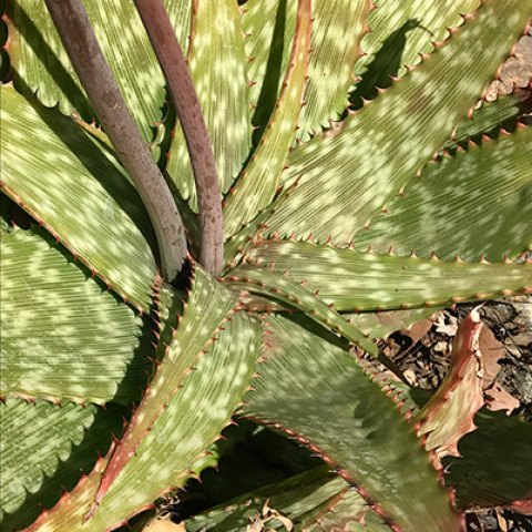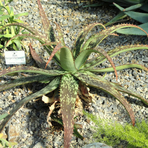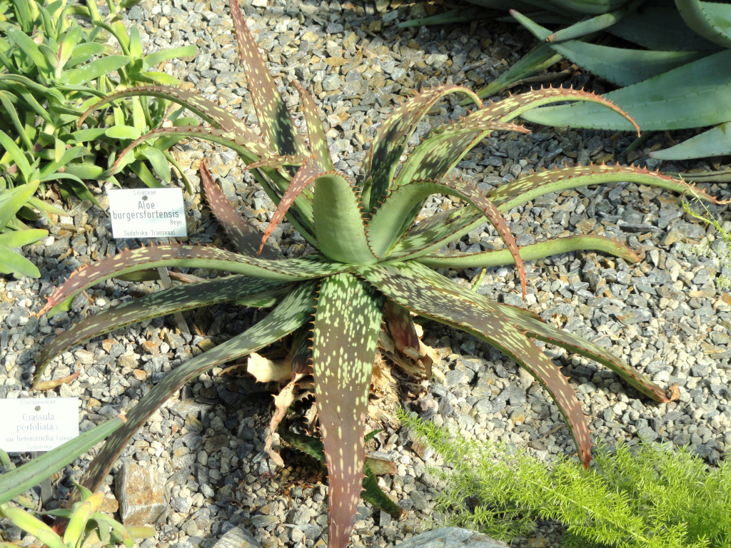 Aloe burgersfortensis, Asphodelaceae familyasına ait, dekoratif yaprak deseni ve yayvan rozet formu ile öne çıkan bir Aloe türüdür. Doğal olarak Güney Afrika’nın kayalık ve yarı kurak bölgelerinde yayılım gösterir. Bu tür, genellikle iyi drenajlı, mineral ağırlıklı ve düşük organik içerikli topraklarda gelişim gösterir. Kuraklık toleransı yüksek olan Aloe burgersfortensis, suyu yaprak dokularında depolayarak uzun süre susuzluğa dayanabilir. Doğal habitatında açık alanlarda, yoğun güneş ışığı altında büyür ve bu özellik yetiştirme koşullarına doğrudan yansır. Aloe burgersfortensis’in yaprakları geniş, uzun ve hafif eğimli yapıdadır. Yapraklar rozet merkezinden dışa doğru yayılır ve zamanla yere yakın, yatay bir form alabilir. Yaprak yüzeyi en dikkat çekici özelliklerinden biridir; yeşil zemin üzerinde açık renkli, düzensiz benekler veya lekeler bulunur. Bu desen, bitkiye kamuflaj benzeri bir görünüm kazandırır. Renk tonları çevresel koşullara bağlı olarak değişebilir. Güçlü ışık altında yapraklarda kızıl, kahverengi veya bronz tonlar belirginleşebilir. Yaprak kenarlarında küçük ve keskin dişler yer alır. Bu dişler düzenli aralıklarla sıralanır ve türün karakteristik yapısal özelliklerinden biridir.