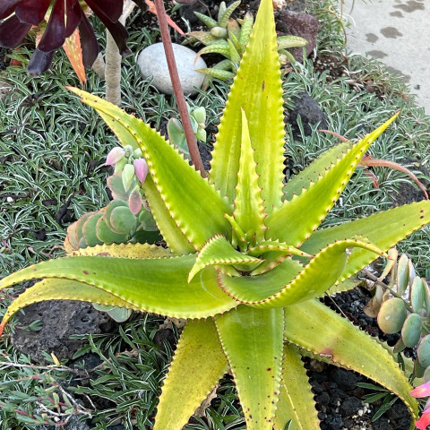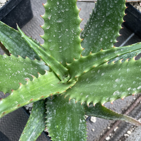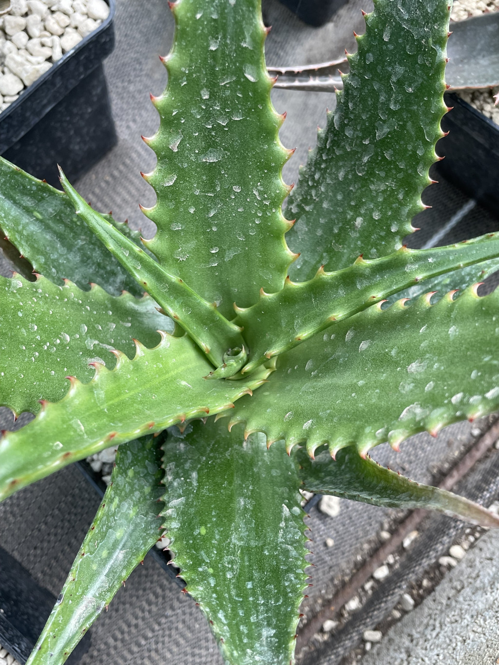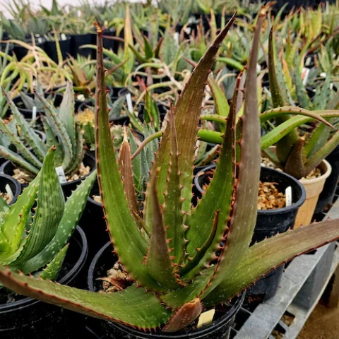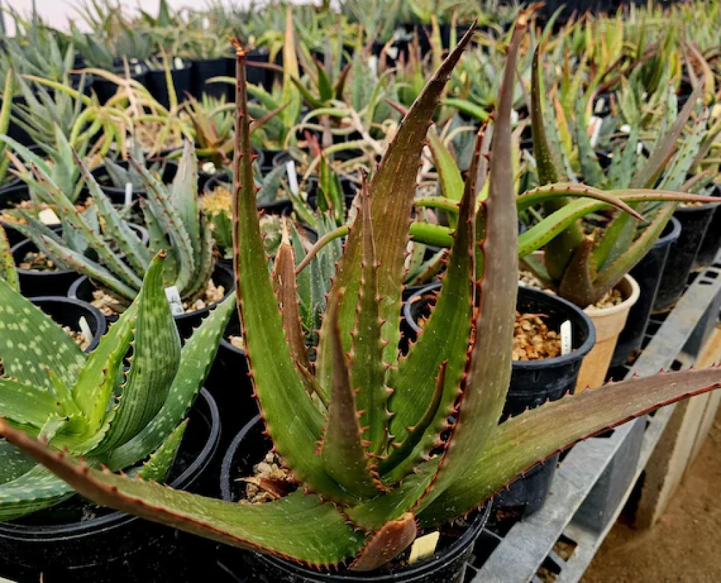 Aloe butiabana, Asphodelaceae familyasına ait, dik gelişim gösteren ve belirgin çiçeklenme yapısıyla öne çıkan bir Aloe türüdür. Doğal olarak Doğu Afrika’nın tropikal ve yarı kurak bölgelerinde yayılım gösterir. Bu tür, çoğunlukla açık alanlarda, iyi drenajlı ve mineral ağırlıklı topraklarda yetişir. Habitatında mevsimsel yağışlara adapte olmuş bir yapı sergiler. Bu nedenle hem kısa süreli kuraklığa dayanabilir hem de uygun koşullarda hızlı gelişim gösterebilir. Aloe butiabana’nın yaprakları uzun, dar ve mızrak formundadır. Yapraklar rozet şeklinde dizilir ancak zamanla daha dik ve açık form alabilir. Yaprak yüzeyi genellikle düz olmakla birlikte, bazı bireylerde hafif lekelenmeler veya ton farklılıkları görülebilir. Renk genellikle parlak yeşildir ancak yoğun ışık altında sarımsı yeşil veya hafif kızaran tonlar oluşabilir. Yaprak kenarlarında belirgin, düzenli aralıklarla dizilmiş küçük dişler bulunur. Bu dişler keskin yapıdadır ve türün karakteristik özelliklerinden biridir. Yaprak uçları sivri ve serttir.