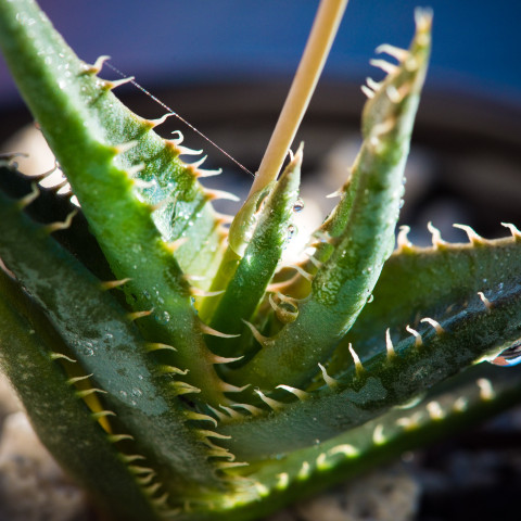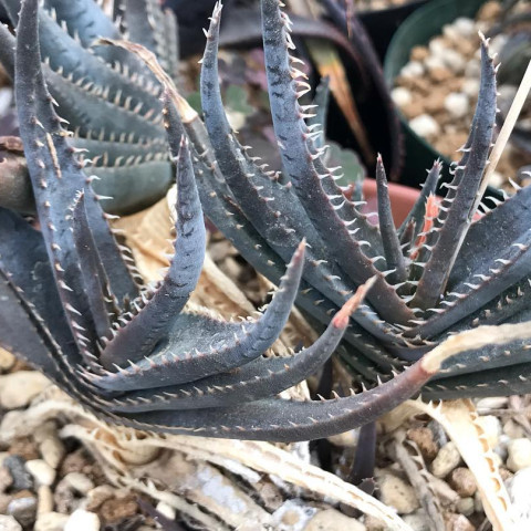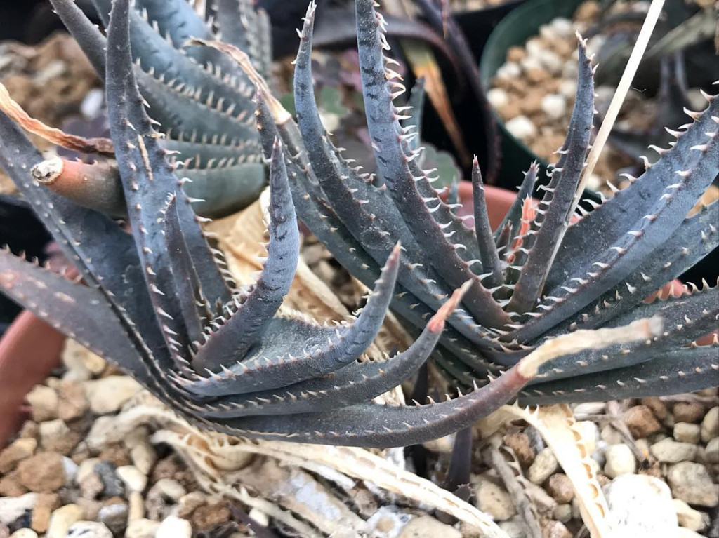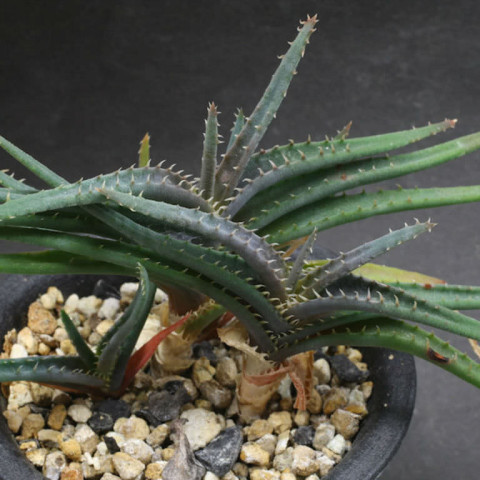 Aloe calcairophila, Asphodelaceae familyasına ait, kompakt yapısı ve koyu tonlu yapraklarıyla dikkat çeken Aloe türlerinden biridir. Doğal olarak kireçtaşı ağırlıklı zeminlerde gelişim gösterir ve tür ismi de bu özelliğe atıfta bulunur. Bu bitki, genellikle kurak ve yarı kurak bölgelerde, yüksek drenajlı ve mineral bakımından zengin fakat organik madde açısından fakir topraklarda yetişir. Adaptasyon kabiliyeti yüksek olmakla birlikte, özellikle kök bölgesinde su tutulumuna karşı hassastır. Aloe calcairophila’nın yaprakları dar, uzun ve belirgin şekilde sivri uçludur. Yapraklar rozet formunda dizilir ve çoğunlukla yataya yakın bir açıyla gelişir. Türün en ayırt edici özelliklerinden biri yaprak rengidir. Yaprak yüzeyi gri-yeşil, koyu yeşil hatta morumsu tonlara kadar değişebilir. Özellikle yoğun ışık ve stres koşullarında daha koyu ve dramatik renklenmeler gözlemlenir. Yaprak yüzeyi mat yapıdadır ve bazı örneklerde hafif pürüzlü bir doku görülebilir. Yaprak kenarları boyunca düzenli aralıklarla dizilmiş belirgin dişler bulunur. Bu dişler keskin yapıdadır ve türün karakteristik görünümünü güçlendirir.