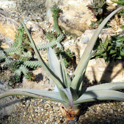 Aloe calidophila, Asphodelaceae familyasına ait, kurak ve sıcak iklim koşullarına güçlü şekilde adapte olmuş bir Aloe türüdür. Doğal olarak Afrika’nın yarı çöl ve açık savan alanlarında yayılım gösterir. Bu tür, yüksek sıcaklık toleransı ve düşük su ihtiyacı ile dikkat çeker. Habitatında genellikle kumlu, taşlı ve hızlı drenaj sağlayan zeminlerde gelişim gösterir. Organik madde bakımından fakir topraklara uyum sağlayabilmesi, yetiştirme koşullarında da benzer bir ortam gerektirdiğini gösterir. Aloe calidophila’nın yaprakları uzun, geniş ve aşağı doğru eğimli yapıdadır. Yapraklar rozet formunda dizilir ancak zamanla daha açık ve yayvan bir görünüm alır. Yaprak yüzeyi genellikle pürüzsüzdür ve belirgin bir etli yapıdadır. Renk tonları açık yeşilden sarımsı yeşile kadar değişebilir. Yoğun güneş ışığı altında yapraklarda kızıl, turuncu veya bronz tonlar oluşabilir. Yaprak kenarlarında küçük, düzenli aralıklarla dizilmiş dişler bulunur. Bu dişler keskin yapıdadır ve bitkinin karakteristik özelliklerinden biridir.