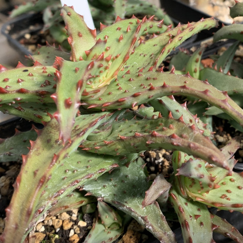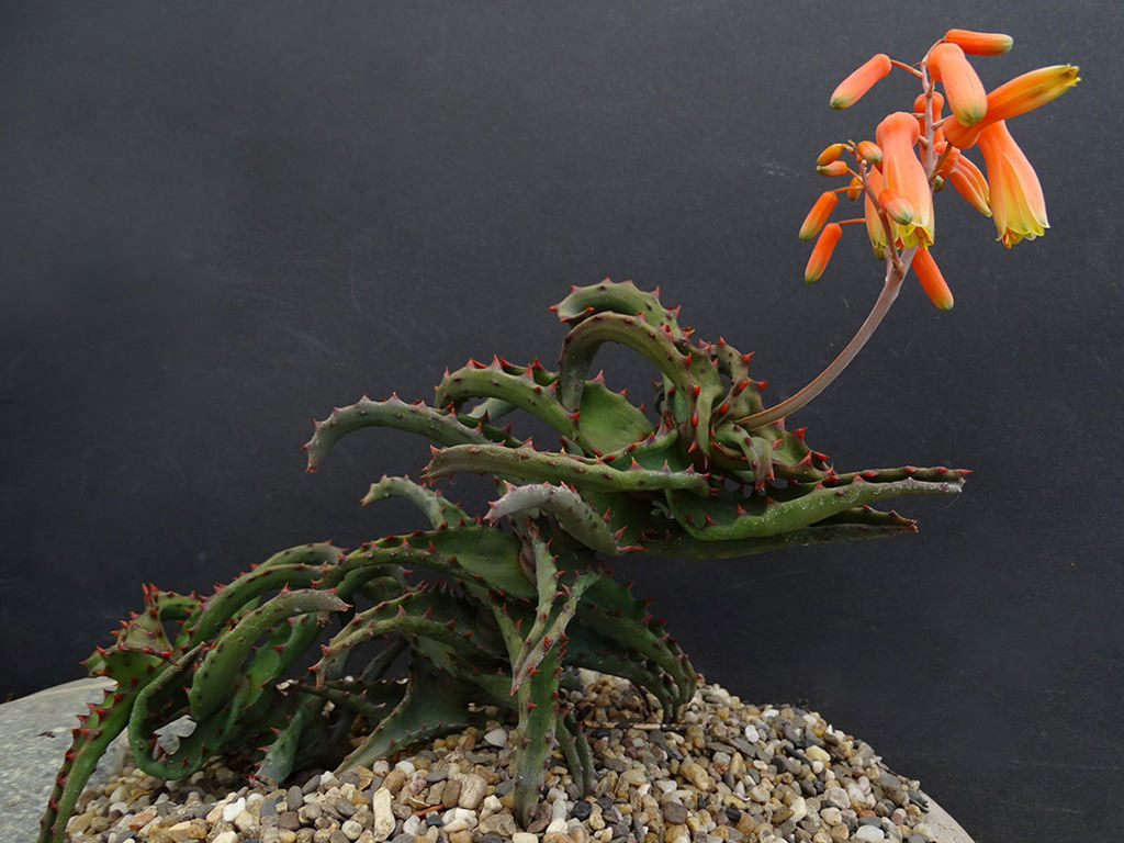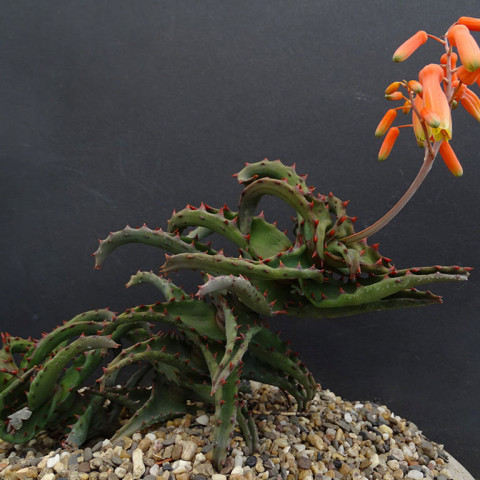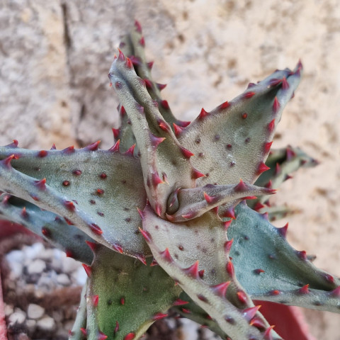 Aloe castilloniae, Asphodelaceae familyasına ait, Madagaskar kökenli nadir Aloe türlerinden biridir ve kompakt gelişim formu ile dikkat çeker. Doğal habitatında genellikle kayalık ve drenajı yüksek alanlarda yayılım gösterir. Bu tür, kuraklığa adapte olmuş yapısı sayesinde suyu bünyesinde depolayabilen sukulent karakter sergiler. Gelişim formu çoğunlukla küçük rozetler halinde olur ve zamanla dipten yeni sürgünler vererek kümelenme eğilimi gösterebilir. Yavaş büyüyen bir tür olarak bilinir ve bu özelliği bakım koşullarında aşırı müdahale gerektirmemesini sağlar. Aloe castilloniae yaprakları kalın, etli ve su tutma kapasitesi yüksek bir yapıdadır. Yapraklar genellikle dar ve üçgensi formda olup rozet etrafına simetrik şekilde dizilir. Yüzey dokusu çoğunlukla pürüzsüzdür ancak bazı örneklerde hafif benekli ya da desenli yapı görülebilir. Yaprak kenarlarında küçük, düzenli aralıklarla dizilmiş dişler bulunur. Renk tonları çevresel koşullara bağlı olarak değişkenlik gösterebilir; genellikle açık yeşilden koyu yeşile kadar uzanan tonlar hâkimdir. Yüksek ışık koşullarında yapraklarda hafif kırmızımsı veya bronzlaşma etkisi gözlemlenebilir. Düşük ışıkta ise renk daha soluk ve form daha gevşek olabilir.