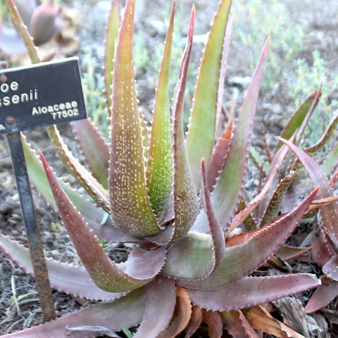 Aloe classenii, Asphodelaceae familyasına ait, Afrika kökenli Aloe türlerinden biridir ve özellikle benekli yaprak yüzeyi ile ayırt edilen bir türdür. Doğal ortamında genellikle yarı kurak bölgelerde, taşlık ve iyi drenajlı topraklarda gelişim gösterir. Bu tür rozet formunda büyür ve uygun koşullarda dipten sürgünler oluşturarak zamanla kümelenebilir. Kuraklık toleransı yüksek olup, suyu yapraklarında depolayarak düzensiz yağış koşullarına adapte olur. Aloe classenii yaprakları geniş tabanlı, üçgensi ve uçlara doğru sivrilen formdadır. Yapraklar rozet etrafında açık ve yayvan bir dizilim gösterir. Yüzey dokusu genellikle mat olup belirgin koyu renkli benekler içerir. Bu benekler yaprak boyunca düzensiz şekilde dağılır ve türün ayırt edici özelliklerinden biridir. Yaprak kenarlarında düzenli aralıklarla dizilmiş dişler bulunur. Bu dişler çoğunlukla açık kahverengi veya sarımsı tonlarda olup belirgin bir kenar hattı oluşturur. Yaprak rengi yeşil ile gri-yeşil arasında değişir; yüksek ışık koşullarında kırmızımsı veya pembemsi tonlar gelişebilir. Bu renk değişimi özellikle stres koşullarında daha belirgin hale gelir.