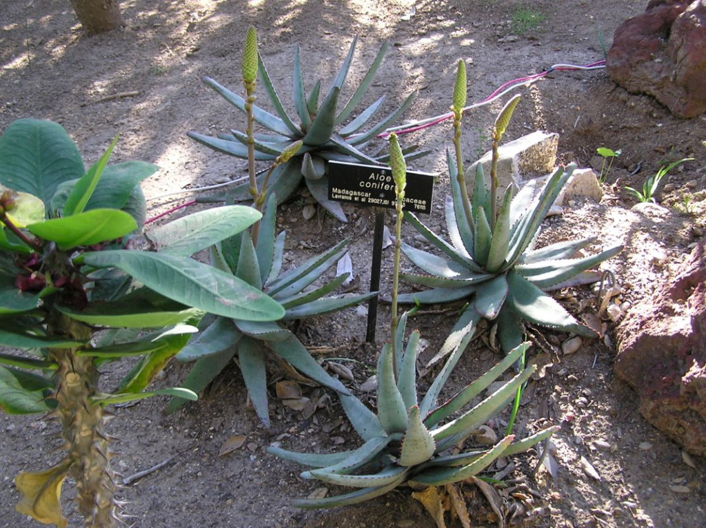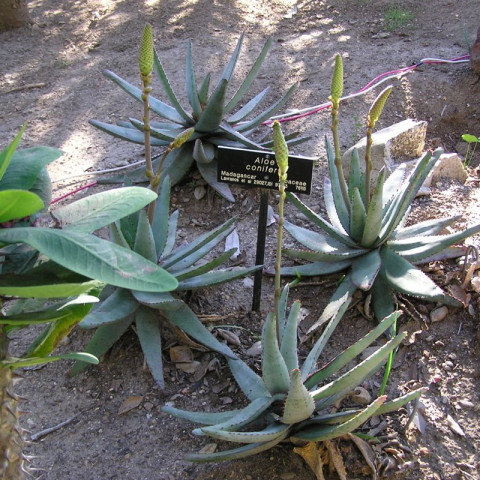 Aloe conifera, Asphodelaceae familyasına ait, Madagaskar kökenli bir Aloe türüdür. Doğal habitatında genellikle kayalık ve mineral bakımından fakir topraklarda, yoğun güneş ışığına maruz kalan açık alanlarda gelişim gösterir. Bu tür, kompakt ve simetrik rozet formu ile öne çıkar. Gövdesi kısa kalma eğilimindedir ve yapraklar merkezden spiral şekilde dizilerek oldukça düzenli bir görünüm oluşturur. Uygun koşullarda zamanla tabandan yeni sürgünler vererek küçük kümeler oluşturabilir, ancak yayılımı kontrollü ve yavaştır. Aloe conifera yaprakları kalın, üçgensi ve sert dokuludur. Yaprak uçları belirgin şekilde sivridir ve kenar boyunca düzenli aralıklarla dizilmiş küçük, keskin dikenler bulunur. Bu dikenler genellikle kırmızımsı veya koyu tonlarda olup yaprak yüzeyiyle kontrast oluşturur. Yaprak yüzeyi düz ve mat yapıdadır. Bu türün en dikkat çekici özelliklerinden biri, yaprak renklerinin çevresel koşullara bağlı olarak değişebilmesidir. Yüksek ışık ve stres koşullarında gri, morumsu veya kırmızı tonlara dönüşebilir. Daha düşük ışıkta ise renkler yeşile yaklaşır ve bitki daha solgun bir görünüm alabilir.
