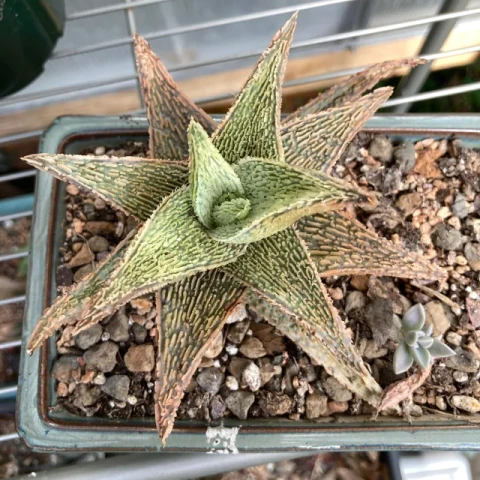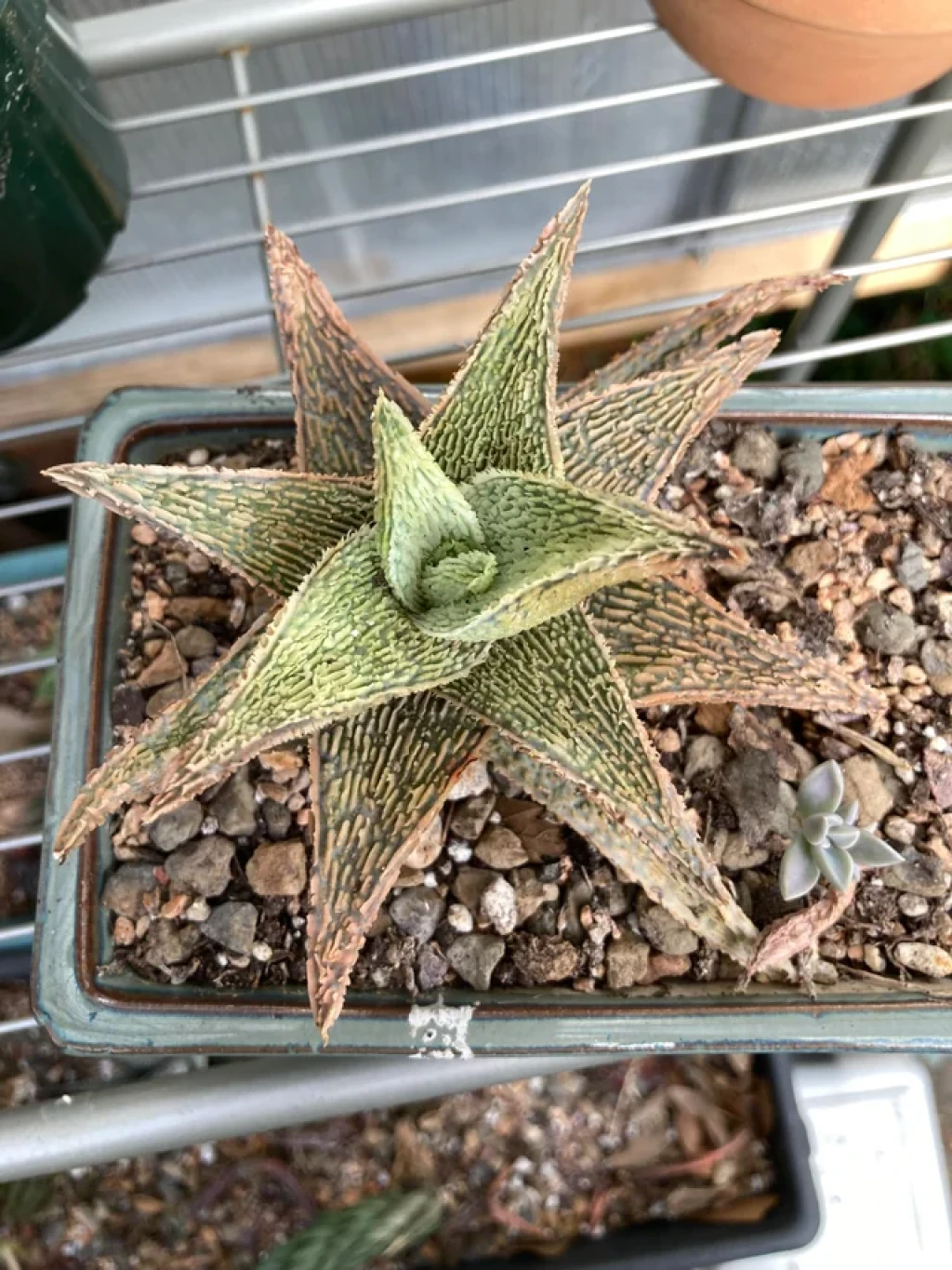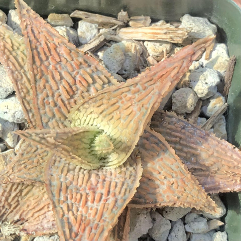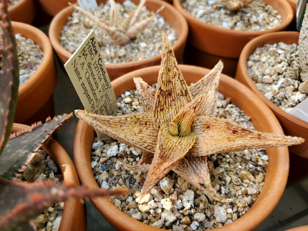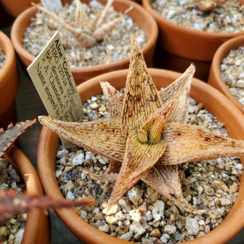 Aloe ‘Corduroy’, yüzeyi kabartmalı yaprak dokusu, yıldız biçimli kompakt rozet formu ve sıra dışı hibrit geçmişi ile dikkat çeken özel Aloe kültivarlarından biridir. Ebeveynleri [(Aloe divaricata × Aloe ‘Dental Work’) × Aloe ‘Chameleon’] olarak kaydedilmiştir. Bu genetik yapı, bitkiye hem belirgin yüzey desenleri hem de güçlü form kazandırmıştır. Koleksiyon değeri taşıyan bu hibrit, özellikle sıra dışı dokuya sahip aloe arayan yetiştiriciler tarafından tercih edilir. Uygun bakım koşullarında yavaş fakat dengeli şekilde gelişir ve formunu uzun süre koruyabilir. Aloe ‘Corduroy’ yaprakları kalın, sert dokulu ve su depolama kapasitesi yüksek yapıdadır. Bitkinin en dikkat çekici özelliği, yaprak yüzeyinde görülen kabartılı ve çizgisel çıkıntılardır. Bu doku, kumaş yüzeyini andırdığı için kültivara “Corduroy” adı verilmiştir. Yapraklar üçgensi formda, sivri uçlu ve rozet çevresine dengeli biçimde dizilir. Renk genç yapraklarda açık yeşil tonlardan başlayabilir, olgunlaştıkça gri-yeşil, zeytin yeşili, bronz veya bakıra yakın tonlara dönüşebilir. Güçlü ışık altında sıcak tonlar daha belirgin hale gelebilir. Yaprak kenarlarında küçük dişler bulunur. Sağlıklı örneklerde yapraklar kısa, sık ve merkez çevresinde simetrik şekilde yerleşir.