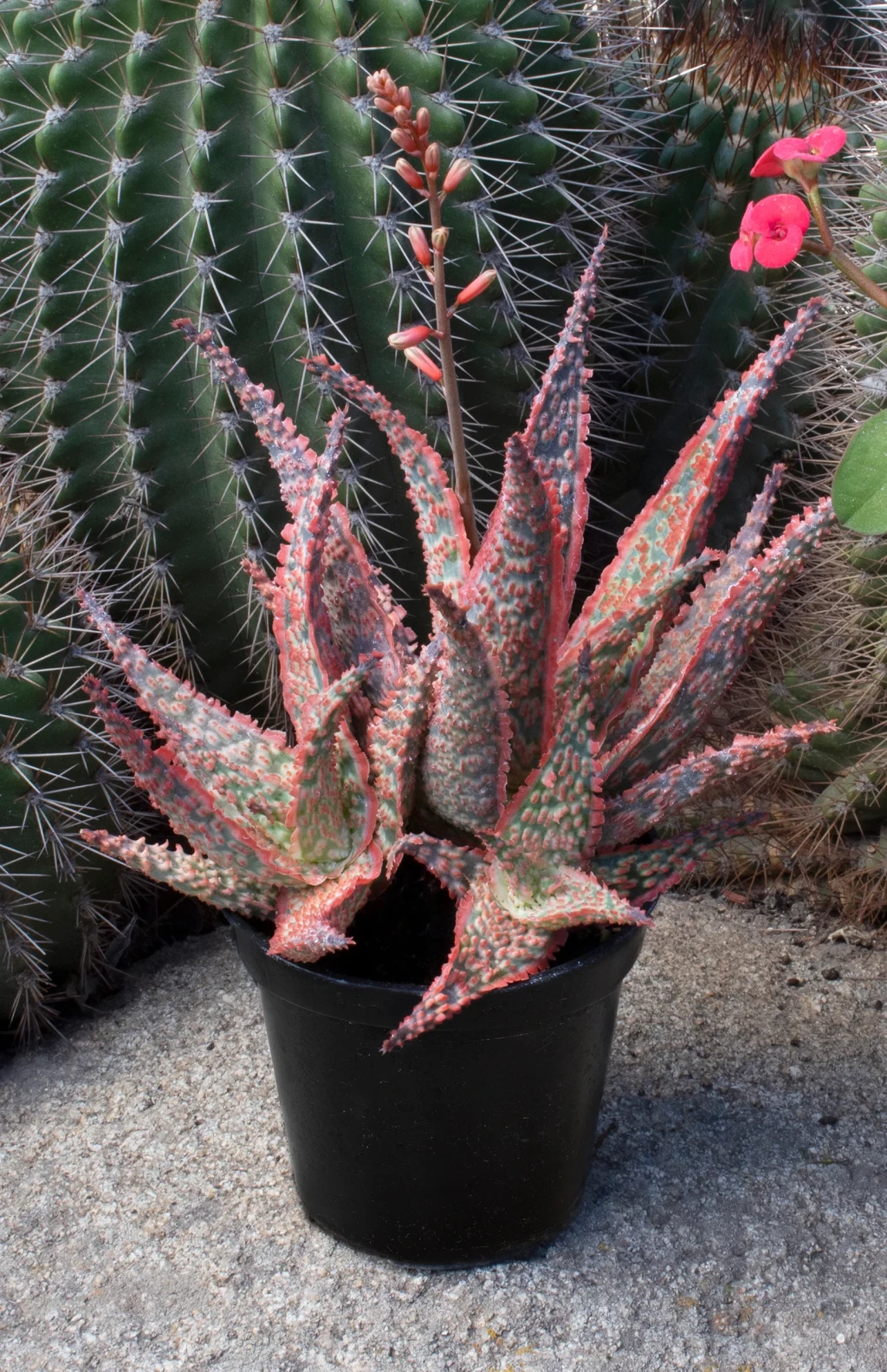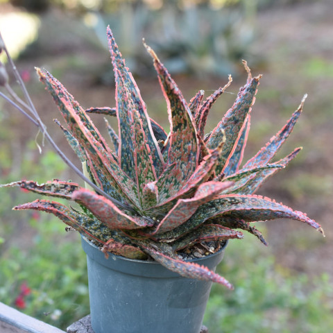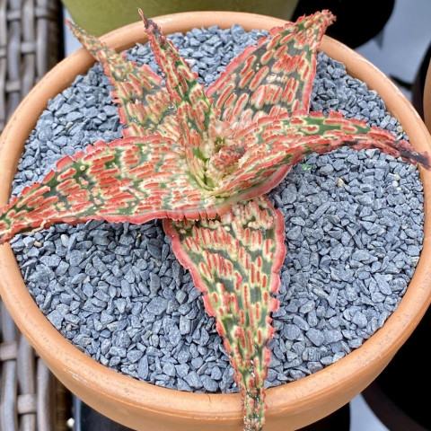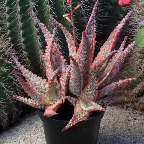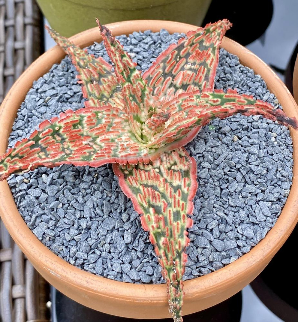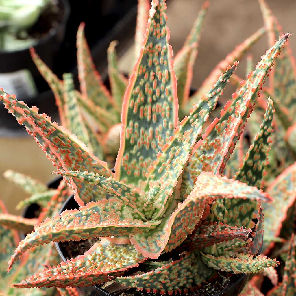 Aloe ‘Crimson Dragon’ yaprakları etli ve su depolama kapasitesi yüksek yapıdadır. Yaprak formu geniş tabanlı başlayıp uca doğru sivrilen üçgensi bir yapı gösterir. Bu hibritte en belirgin özellik, yaprak yüzeyinde bulunan kabartılı doku ve yoğun beneklenmedir. Yaprak yüzeyi yalnızca renk ile değil, fiziksel olarak da pürüzlü bir yapı sunar. Bu kabartılar, ışık altında daha belirgin hale gelir ve bitkiye üç boyutlu bir görünüm kazandırır. Renk dağılımı genellikle yeşil zemin üzerinde yoğun kırmızı, turuncu ve bakır tonlarının kombinasyonu şeklindedir. Özellikle yaprak kenarlarında ve yüzeydeki kabartılarda kırmızı pigment yoğunluğu artar. Yüksek ışık koşullarında bu renk kontrastı daha keskin hale gelir. Yaprak kenarlarında düzenli aralıklarla dizilmiş dişsi çıkıntılar bulunur. Bu dişler, pigmentasyon ile birlikte daha belirgin bir görünüm kazanır. Yaprak kalınlığı belirgindir; ancak bu türde dikkat çeken ana unsur hacimden ziyade yüzey yoğunluğu ve doku detaylarıdır.