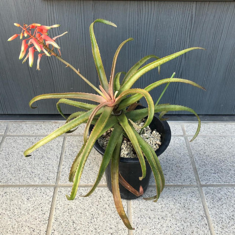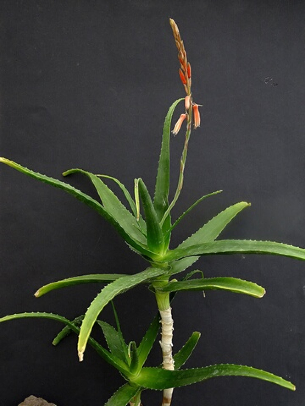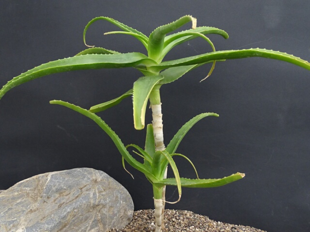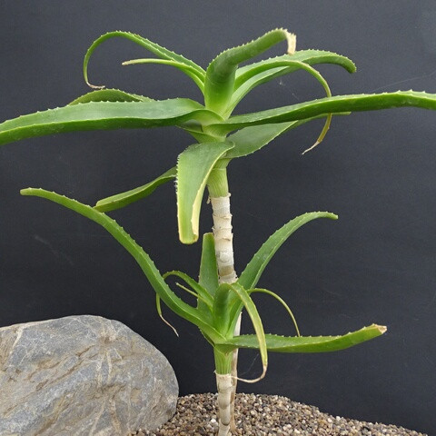 Aloe delphinensis, Asphodelaceae familyasına ait, Madagaskar kökenli ve gövde oluşturan gelişim formu ile dikkat çeken bir Aloe türüdür. Doğal habitatında genellikle kayalık, iyi drenajlı ve güneşli alanlarda gelişir. Bu tür, zamanla belirgin bir gövde oluşturur ve yapraklarını gövde boyunca aralıklı rozetler halinde taşır. Gelişim formu dikeydir ve yaşlandıkça alt yapraklarını dökerek gövdeyi açığa çıkarır. Uygun koşullarda orta boyutlu, dik formda bir bitki haline gelir. Aloe delphinensis yaprakları uzun, dar ve hafif kıvrımlı yapıdadır. Yapraklar gövde üzerinde belirli aralıklarla oluşan rozetler şeklinde dizilir. Yaprak yüzeyi genellikle düz ve mat yapıdadır. Renkleri çoğunlukla açık yeşil ile gri-yeşil tonlar arasında değişir. Yüksek ışık koşullarında yaprak uçlarında veya kenarlarında hafif kızarıklıklar görülebilir. Yaprak kenarlarında küçük ve düzenli dikenler bulunur. Bu dikenler genellikle açık renkli olup yaprak yüzeyi ile uyumlu bir görünüm oluşturur. Yaprak dokusu su depolamaya uygundur ve kuraklık toleransını destekler.