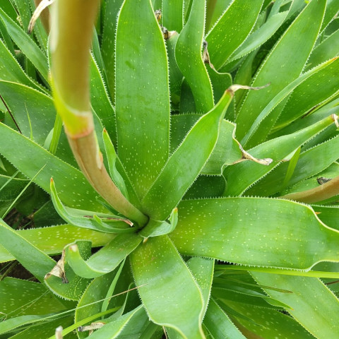 Aloe ecklonis, Asphodelaceae familyasına ait, doğal olarak Güney Afrika’nın belirli bölgelerinde yayılım gösteren çok yıllık bir sukulent türüdür. Genellikle kompakt rozet yapısı oluşturarak gelişir ve uygun koşullarda zamanla yan sürgünler vererek kümelenme eğilimi gösterebilir. Doğal habitatında güneşli ve iyi drenajlı alanlarda yetişen Aloe ecklonis, kültür ortamında da benzer koşullar sağlandığında stabil bir gelişim sergiler. Aloe ecklonis yaprakları etli, su depolama kapasitesi yüksek ve belirgin şekilde rozet formunda dizilmiştir. Yaprak yüzeyi çoğunlukla düz ya da hafif pürüzlü olabilir. Renk tonu çevresel faktörlere bağlı olarak değişkenlik gösterebilir; açık yeşilden koyu yeşile kadar farklı tonlar gözlemlenebilir. Yüksek ışık altında bazı bireylerde yaprak kenarlarında kızarıklık veya pigment yoğunlaşması oluşabilir. Yaprak kenarlarında küçük dişsi yapılar bulunur ve bu yapı bitkinin karakteristik morfolojik özelliklerinden biridir. Yaprak dokusu, fazla nem ve düşük hava sirkülasyonu koşullarında bozulmaya eğilimlidir.