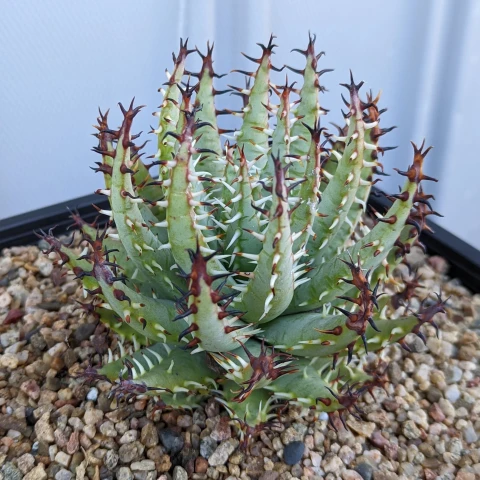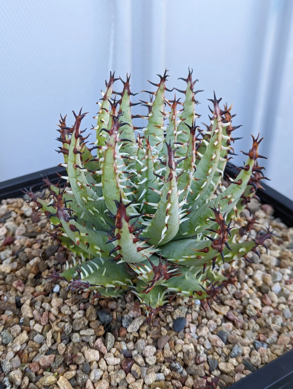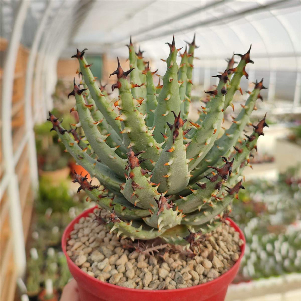 Aloe erinacea, kompakt yapısı ve yoğun dikenli görünümü ile ayırt edilen, nadir ve koleksiyon değeri yüksek Aloe türlerinden biridir. Güney Afrika kökenli olan bu tür, doğal ortamında kurak ve taşlı arazilerde gelişim gösterir. Genellikle küçük ve sıkı rozet formunda büyür. Gövde çoğunlukla belirgin değildir veya çok kısa kalır. Yavaş büyüme eğilimi gösteren bu tür, uygun koşullarda zamanla küçük kümeler oluşturabilir. Aloe erinacea yaprakları kısa, kalın ve üçgenimsi formdadır. Yaprak yüzeyi gri-yeşil veya mavimsi yeşil tonlarda olabilir. Bu türün en belirgin özelliği, yaprak yüzeyi ve kenarları boyunca yoğun şekilde yerleşmiş koyu renkli diken yapılarıdır. Dikenler genellikle koyu kahverengi, siyaha yakın tonlarda olup, yaprağın yüzeyinde kabartılı bir görünüm oluşturur. Yaprak kenarlarında da belirgin dişler bulunur. Yaprak uçları sivri ve serttir. Bu yoğun dikenli yapı, bitkiye koruyucu bir adaptasyon kazandırır. Yaprak dokusu su depolamaya uygundur ancak aşırı nem koşullarında hassasiyet gösterebilir.