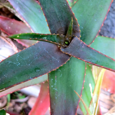 Aloe erythrophylla, özellikle yaprak renklenmesiyle öne çıkan, kompakt gelişimli bir Aloe türüdür. Doğal olarak Madagaskar kökenli olan bu tür, kurak ve yarı kurak bölgelerde, iyi drenajlı topraklarda yetişir. Genellikle gövdesiz ya da çok kısa gövdeli bir yapıya sahiptir ve rozet formunda büyür. Zamanla dipten sürgünler oluşturarak kümelenebilir ve genişleyen bir form kazanabilir. Bu özellik, bitkinin hem saksıda hem de peyzaj düzenlemelerinde grup halinde kullanımına olanak sağlar. Aloe erythrophylla yaprakları üçgenimsi, geniş tabanlı ve uçlara doğru daralan bir yapıdadır. Yaprak yüzeyi düz ve hafif parlak olabilir. Temel renk tonu yeşil olmakla birlikte, yüksek ışık ve çevresel stres koşullarında belirgin şekilde kırmızı veya bakır tonlarına dönebilir. Bu renk değişimi türün en karakteristik özelliklerinden biridir. Yaprak yüzeyinde zaman zaman düzensiz lekelenmeler veya hafif desenler görülebilir. Yaprak kenarlarında küçük, düzenli ve genellikle kırmızımsı dişler bulunur. Yaprak uçları sivridir. Yaprak dokusu su depolamaya uygundur ancak uzun süreli aşırı nem koşullarında hassasiyet gösterebilir.