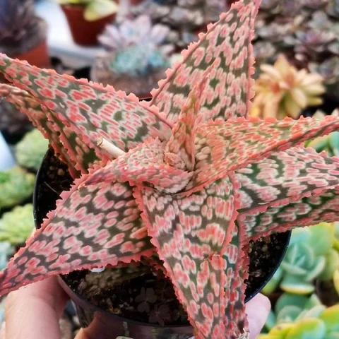 Aloe 'Firecracker', küçük boyutlu fakat güçlü renklenme potansiyeline sahip hibrit aloe türlerinden biridir. Adını, yaprak yüzeyinde oluşabilen sıcak tonlardan ve canlı görünümünden alır. Tohum ebeveyni Aloe 'Pink Blush' iken, polen ebeveyni ise Aloe divaricata, Aloe 'Pink Blush' ve belirtilmemiş bir başka Aloe türünün çaprazlanması sonucu elde edilen bir türdür. Kompakt rozet yapısı, desenli yaprakları ve kümelenerek gelişme eğilimi sayesinde saksı yetiştiriciliğinde sık tercih edilir. Pek çok hibrit aloe gibi dekoratif görünümü ön plandadır; ancak doğru bakım koşulları sağlandığında uzun ömürlü ve dayanıklı bir sukulent olarak yetiştirilebilir. Kuraklığa uyumlu yapısı sayesinde suyu depolayabilir, bu nedenle bakımda en önemli konu fazla sulamadan kaçınmaktır.