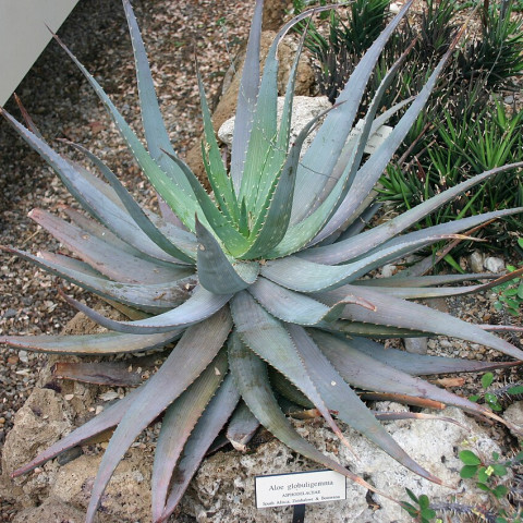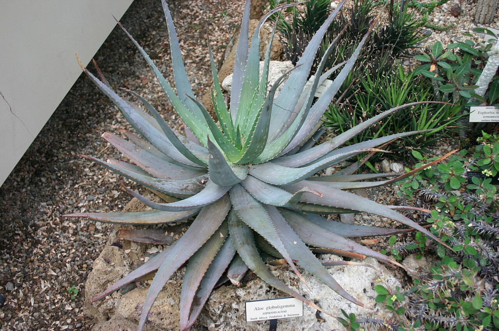 Aloe globuligemma, Aloe cinsi içerisinde özellikle dallanmış çiçek yapısı ile öne çıkan, Güney Afrika kökenli bir sukulent türüdür. Doğal olarak kurak ve yarı kurak bölgelerde, taşlık ve iyi drenajlı topraklarda gelişim gösterir. Bu tür, zamanla birden fazla rozet oluşturarak kümeler halinde büyür. Bu büyüme formu, bitkinin hem yatay hem de yoğun bir şekilde genişlemesine olanak tanır ve peyzaj kullanımında dolgun bir görünüm sağlar. Bitkinin yaprakları kalın, etli ve mızrak formundadır. Renk genellikle gri-yeşil ile mavi-yeşil arasında değişir ve yüzeyde hafif mat bir görünüm bulunabilir. Yaprak kenarlarında küçük ve düzenli dişler yer alır. Rozet yapısı genellikle orta büyüklüktedir ve uygun koşullarda kompakt kalır. Yetersiz ışık durumunda yapraklar uzayarak form kaybı yaşanabilir ve rozet yapısı gevşer.