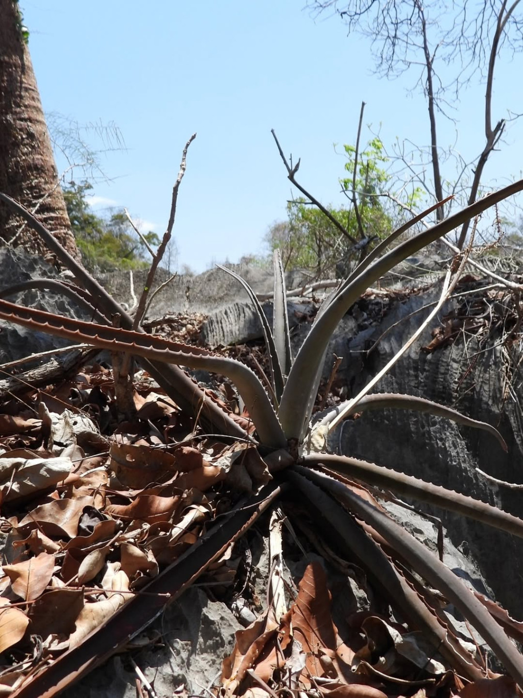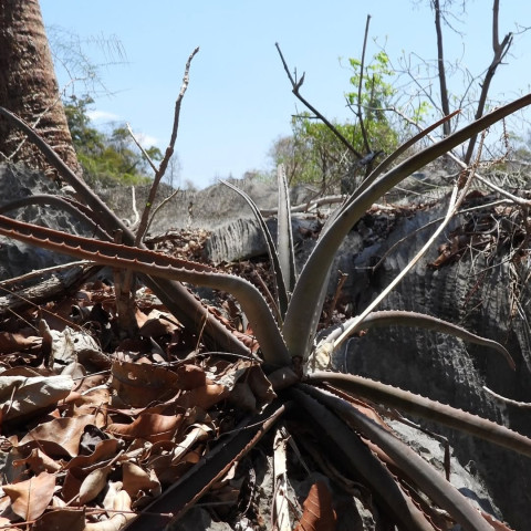 Aloe megalocarpa, birçok iri gövdeli aloe türünün aksine daha alçak yapılı kalır ve yayvan rozetler oluşturarak gelişir. Tür, özellikle dar yaprak yapısı ve çiçek sapı üzerinde sıralanan turuncu-kırmızı tonlu çiçekleriyle tanınır. Uygun koşullarda dipten yeni sürgünler vererek zamanla küçük kümeler oluşturabilir. Bitki rozet formunda büyür. Yapraklar uzun, dar, hafif kavisli ve esnek yapıdadır. Diğer birçok aloe türüne göre daha ince yapraklı görünür. Yaprak rengi çoğunlukla yeşildir; güneş, kuraklık veya yaşlanmaya bağlı olarak sarımsı ya da bronzumsu tonlar oluşabilir. Bazı bireylerde alt yapraklar açık sarı-yeşil renge dönebilir. Yaprak kenarlarında küçük fakat düzenli dişler bulunur. Bu dişler keskin görünse de iri değildir. Yaprak uçları sivridir ve zaman zaman aşağı doğru kıvrılabilir. Alt yapraklar yaşlandıkça kurur, incelir ve tabandan ayrılabilir. Merkezden çıkan genç yapraklar daha canlı ve dik formda olur.