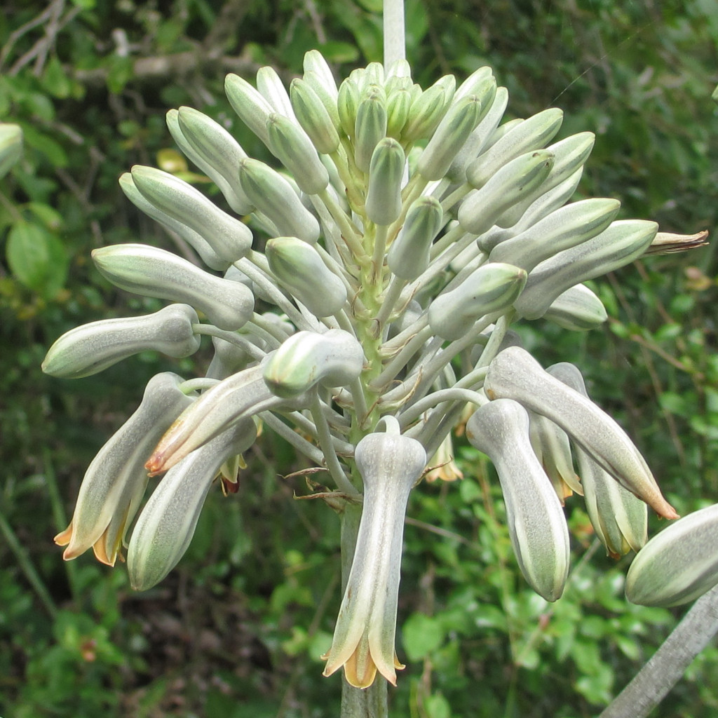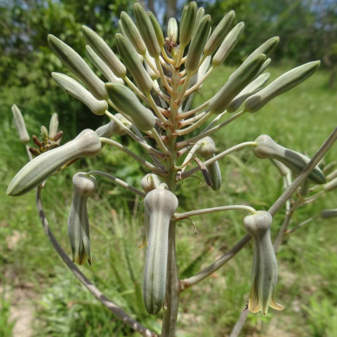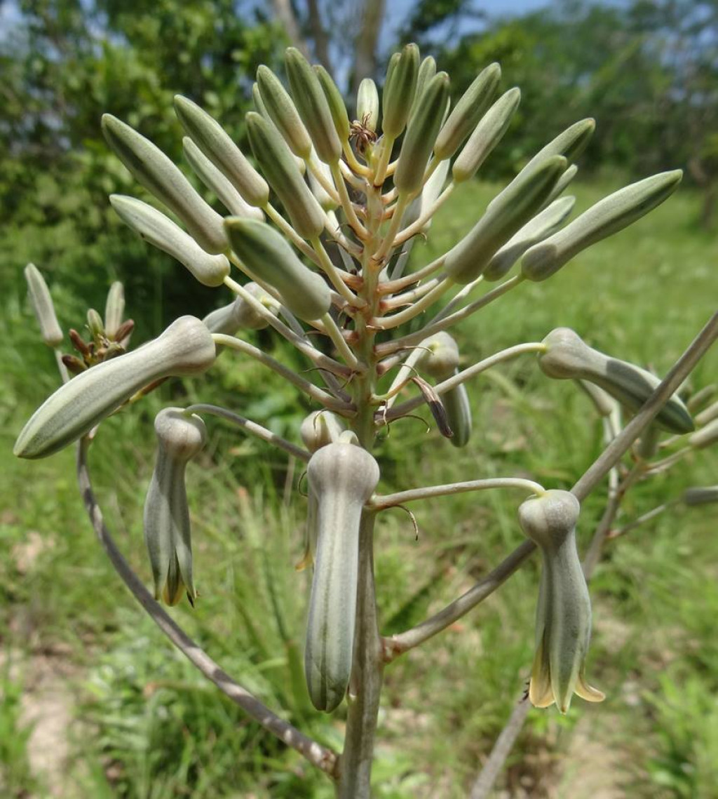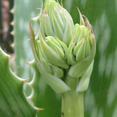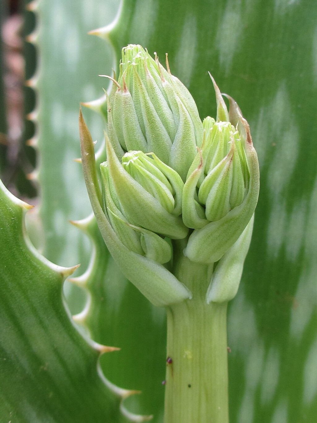 Aloe menyharthii, açık renkli çiçekleri ile dikkat çeken nadir Aloe türlerinden biridir. Afrika kökenli bu tür, doğal yaşam alanlarında mevsimsel yağış alan açık arazilerde, çayırlarda ve taşlı topraklarda gelişir. Diğer birçok Aloe türüne göre daha yumuşak ve ince hatlı bir görünüm sergiler. Özellikle gri-yeşil tonlara yaklaşan çiçek sapları ile soluk beyazımsı çiçekleri, türün ayırt edilmesini kolaylaştırır. Bitki genellikle gövdesiz ya da çok kısa gövdeli gelişir. Yapraklar merkezden yıldız biçiminde çıkar ve yere yakın rozet oluşturur. Yaprak formu dar mızraksı yapıdadır. Uçlara doğru incelen yapraklar hafif kavisli olabilir. Renk çoğunlukla açık yeşil, gri-yeşil veya zeytinimsi tonlardadır. Yaprak yüzeyinde düzensiz dağılan beyazımsı lekeler, çizgiler ya da benekli desenler görülebilir. Bu desenler genç yapraklarda daha belirgin olabilir. Kenarlarda küçük ama seçilebilir dişler yer alır. Yaşlandıkça alt yapraklar kuruyarak bitkinin alt kısmında doğal yenilenme görüntüsü oluşturabilir.
