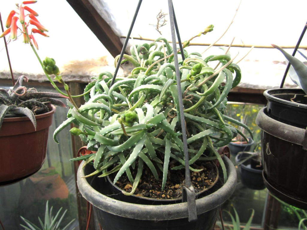 Aloe millotii, ince ve kıvrımlı yapraklarıyla klasik Aloe görünümünden ayrılan, farklı bir gelişim formuna sahip nadir bir türdür. Özellikle yoğun şekilde yavru vererek kümeler oluşturması ve zamanla sarkıcı bir yapı kazanabilmesi nedeniyle koleksiyon yetiştiricileri tarafından ilgi görür. Doğal ortamında kurak, taşlık ve iyi drene olan alanlarda gelişir. Kompakt rozetlerden oluşan genç bitkiler zamanla genişleyerek çok başlı bir görünüm alabilir. Farklı silueti sayesinde aloe koleksiyonlarında kolayca ayırt edilen türlerden biridir. Bu türün yaprakları uzun, dar, etli ve yay şeklinde kıvrımlıdır. Yaprak yüzeyi yeşil ile gri-yeşil arasında değişebilir. Bazı bireylerde açık benekler veya hafif lekelenmeler görülebilir. Kenarlarda küçük dişler bulunur. Yaprakların esnek ve kıvrımlı yapısı bitkiye hareketli bir görünüm kazandırır. Uygun ışıkta daha sıkı gelişir; düşük ışıkta yaprak araları açılabilir ve form bozulabilir. Sağlıklı gelişimde yapraklar dolgun, diri ve merkezden düzenli şekilde çıkar.