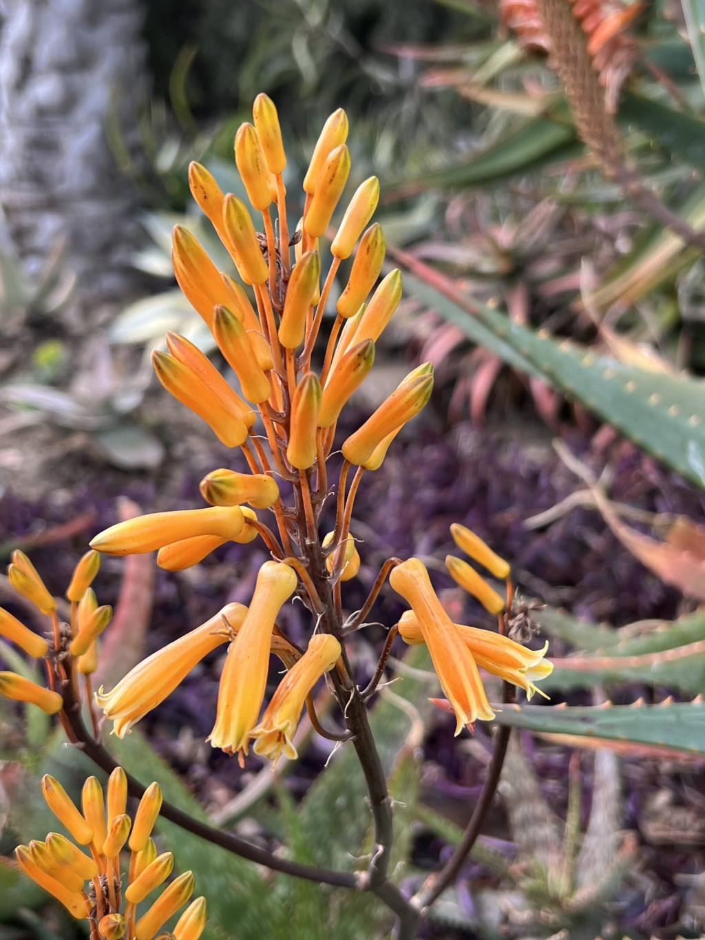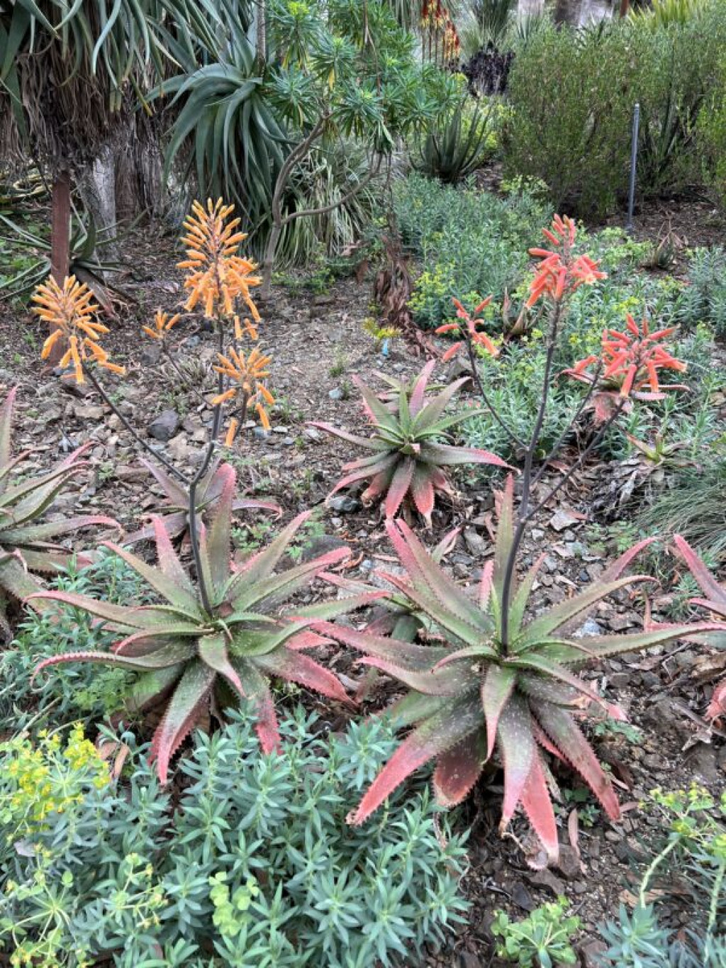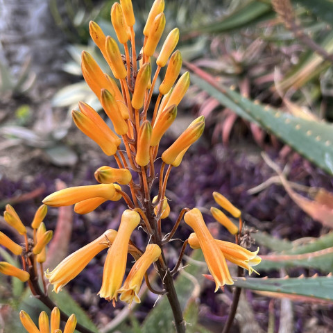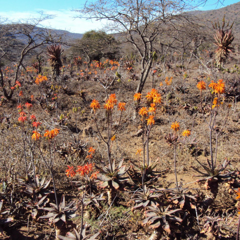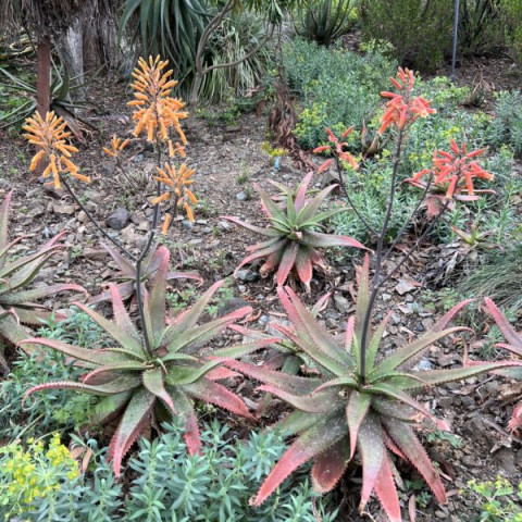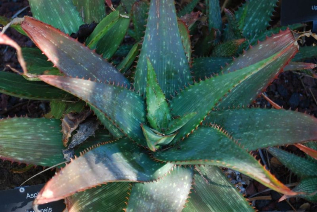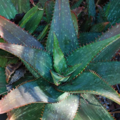 Aloe mudenensis, Güney Afrika kökenli, mevsimsel renk değişimleri ve parlak turuncu çiçekleriyle tanınan bir Aloe türüdür. Doğal olarak kayalık yamaçlarda, güneşli ve geçirgen alanlarda gelişir. Kurak dönemlere dayanıklı yapısı sayesinde yapraklarında su depolar ve zorlu çevre koşullarına uyum sağlar. Tür, tek rozetli başlayıp zamanla yavrulayabilen bir gelişim gösterebilir. Özellikle serin dönemlerde kızaran yaprak tonları ve uzun çiçek sapları nedeniyle peyzaj ve koleksiyon yetiştiriciliğinde ilgi görür. Uygun koşullarda açık alanda geniş alanlara yayılabilir. Aloe mudenensis yaprakları orta boylu, kalın, etli ve geniş mızrak formundadır. Yapraklar merkezde sıkı rozet oluşturur ve dışa doğru açılarak gelişir. Renk çoğunlukla yeşil ile gri-yeşil arasında değişir. Güçlü güneş, serin hava veya kuraklık stresi altında kırmızı, bordo, bronz ya da morumsu tonlar belirginleşebilir. Bu renk değişimi türün en dikkat çekici özelliklerinden biridir. Yaprak yüzeyinde küçük açık renkli benekler görülebilir. Kenarlarda düzenli sıralanmış dişler bulunur ve bu dişler çoğu zaman kızıl tonlara dönebilir. Sağlıklı bireylerde yapraklar dolgun ve sert yapıdadır.