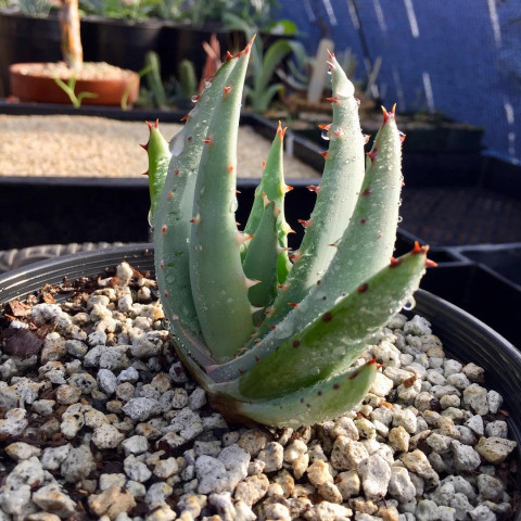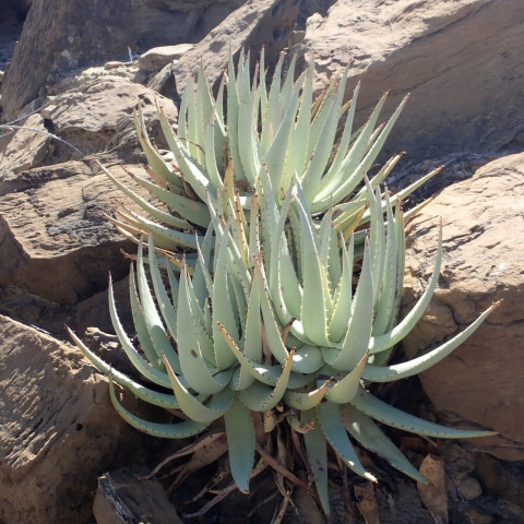 Aloe namibensis, adını doğal olarak yayıldığı Namibya bölgesinden alan, açık renkli yaprakları ve kurak iklimlere uyumlu güçlü yapısıyla dikkat çeken bir Aloe türüdür. Sert ve zorlu habitatlarda yaşayabilmesi, bu türü koleksiyoncular için daha da ilgi çekici hale getirir. Kayalık yamaçlar, taş araları ve hızlı kuruyan mineral ağırlıklı alanlarda gelişim gösterir. Zamanla kümelenerek çok başlı yapılar oluşturabilir ve doğal görünümünü uzun yıllar korur. Aloe namibensis yaprakları kalın, sert dokulu ve belirgin şekilde etlidir. Yaprak formu mızraksı ile üçgensi arasında değişebilir. Renk çoğunlukla açık mavi-yeşil, gri-yeşil veya pudramsı soluk yeşil tonlardadır. Bu mat görünüm, güneş ışığını yansıtarak bitkiye doğal koruma sağlar. Yaprak kenarlarında küçük ama belirgin dişler bulunur. Yapraklar rozet şeklinde dizilir ve uçlara doğru sivrilir.