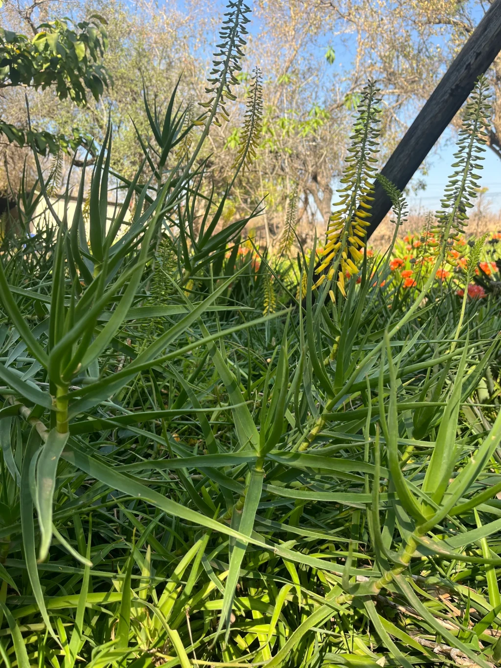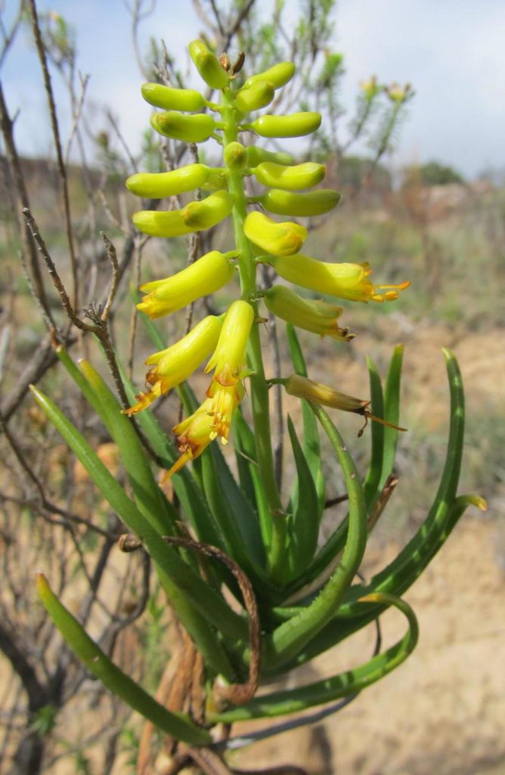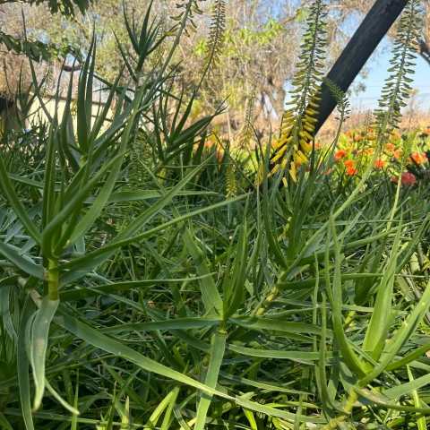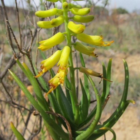 Aloiampelos tenuior, eski adıyla Aloe tenuior, ince gövdeli gelişimi, bol dallanan yapısı ve sarı çiçekleriyle diğer birçok Aloe türünden ayrılan ince yapılı bir sukulenttir. Peyzaj alanlarında geniş kümeler oluşturabilmesi, kuraklığa dayanıklılığı ve uzun süre dekoratif kalabilmesi nedeniyle oldukça değerli bir türdür. Özellikle açık bahçelerde doğal ve hareketli bir görünüm oluşturur. Aloiampelos tenuior yaprakları dar, uzun ve ince yapıdadır. Yapraklar gövde boyunca spiral şekilde dizilir ve gövdeler üzerinde sık yerleşim gösterir. Bu görünüm bitkiye hem hacimli hem de hafif dokulu bir form kazandırır. Yaprak rengi genellikle yeşil ile gri-yeşil tonları arasındadır. Güçlü güneş altında daha mat ve sıkı görünürken, gölgeli alanlarda daha yumuşak yeşil tonlar görülebilir. Yaprak kenarlarında küçük dişler bulunur. Gövdeler yaşlandıkça odunsu yapı kazanabilir ve bitki zamanla geniş koloniler oluşturabilir.