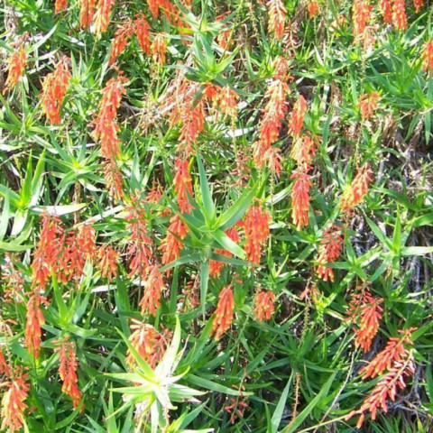 Aloiampelos tenuior var. rubriflora, eski adıyla Aloe tenuiior var. rubriflora, ince gövdeli, dallanan gelişim yapısı ve kırmızı tonlara yakın çiçekleri ile tanınan özel bir varyetedir. Aloiampelos tenuior varyetesidir. Bu bitki, klasik rozet formundaki Aloe türlerinden farklı olarak çalımsı ve yayılıcı gelişim gösterir. İnce sürgünleri üzerinde yapraklar düğüm aralıkları boyunca dizilir ve zamanla yoğun kümeler oluşturabilir. Sukulent karakterli yaprak yapısı sayesinde kurak dönemlere belirli ölçüde uyum sağlayabilir. Aloiampelos tenuior var. rubriflora yaprakları dar, uzun ve ince mızrak formundadır. Yapraklar gövde boyunca sarmal ya da çevresel şekilde dizilir. Gövdeler esnek yapıdadır ve yaşlandıkça dallanarak geniş alan kaplayabilir. Yaprak rengi çoğunlukla açık yeşil ile orta yeşil arasındadır. Güçlü ışık altında daha kompakt gelişim görülebilirken, gölgeli koşullarda sürgünler daha uzun ve gevşek hale gelebilir. Yaprak kenarlarında küçük ve ince dişler bulunur. Bu dişler türün genel zarif görünümünü bozmayacak ölçüde küçüktür. Yaşlanan alt yapraklar zamanla kuruyabilir ve gövde üzerinde doğal izler bırakabilir.
