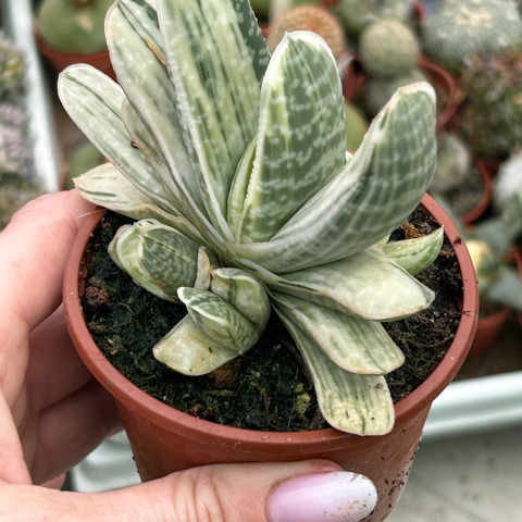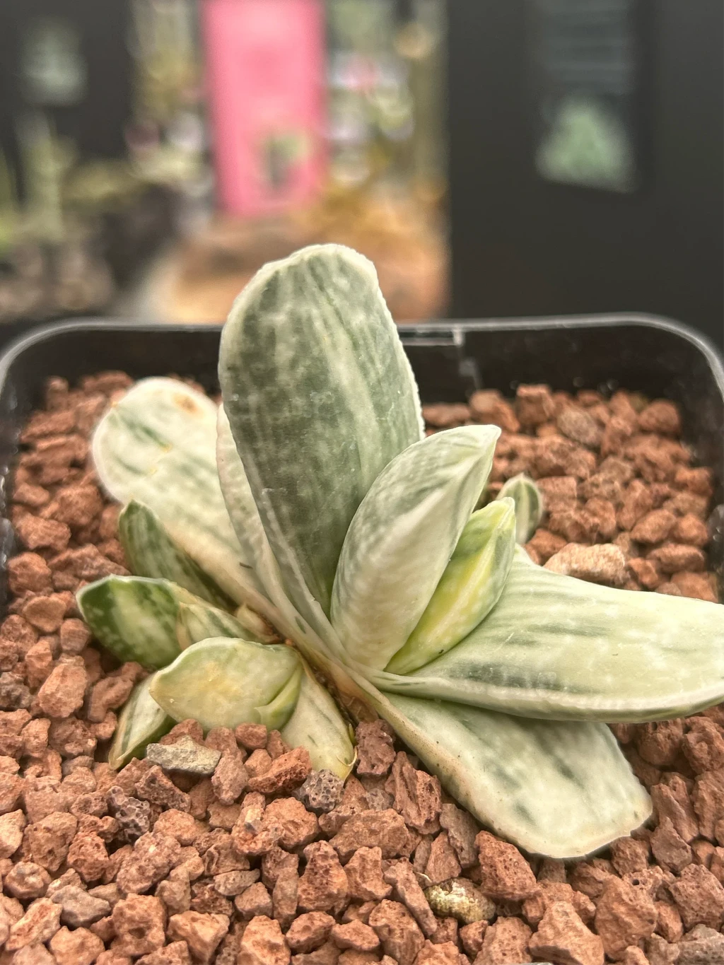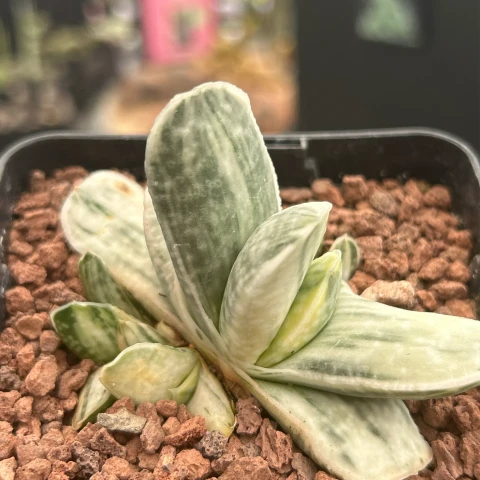 Gasteria ‘Sakura Fuji’ yaprakları kalın, etli ve mızraksı formdadır. Yaprak yüzeyinde gri-yeşil, açık yeşil, krem, gümüşi beyaz ve zaman zaman pembemsi tonlara uzanan karışık desenler görülebilir. Bu mermerimsi görünüm bitkinin en ayırt edici özelliğidir. Her yaprakta desen dağılımı farklı olabilir; bazı yapraklarda geniş açık alanlar, bazılarında çizgisel yeşil geçişler baskın olabilir. Yüzey hafif pütürlü ya da düz hissedilebilir. Yapraklar merkezden çıkarak sıkı rozet oluşturur. Sağlıklı gelişimde yapraklar dolgun, sert ve dengeli dizilimlidir. Güçlü ışık altında renk kontrastı artabilir; serin koşullarda pembemsi tonlar belirginleşebilir.