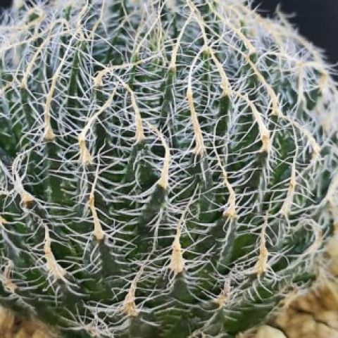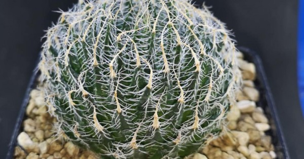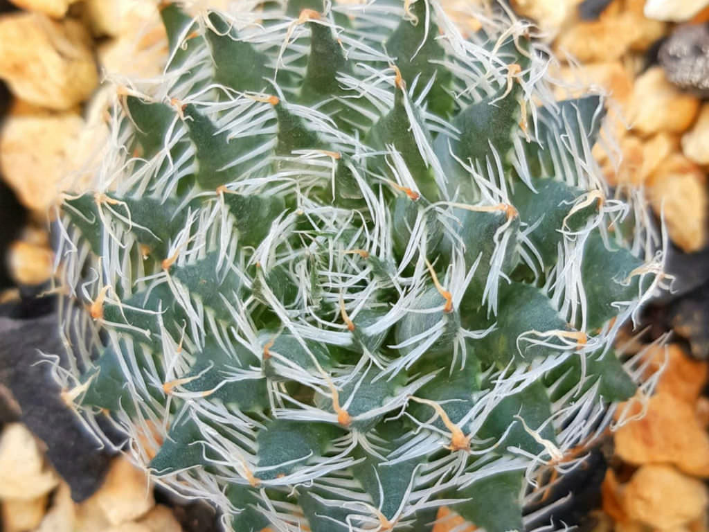 Bu varyetenin en belirgin özelliği, küresel ya da yarı küresel rozet formu ile yapraklar arasına yayılan yoğun beyaz liflerdir. Lifler zamanla bitkinin tepe kısmında ağ benzeri bir tabaka oluşturabilir. Yapraklar üçgensi, kalın ve sivri uçludur. Standart forma göre yaprak yüzeyinde daha sert doku, daha belirgin kenar yapısı ve pürüzlü hissedilen çıkıntılar görülebilir. Yaprak rengi çoğunlukla koyu yeşil ile orta yeşil arasındadır. Güçlü ışık altında ton koyulaşabilir. Sağlıklı bireylerde yapraklar sıkı şekilde dizilir ve rozet formu kompakt kalır. Susuzlukta yapraklarda incelme veya içe kapanma, aşırı nemde ise yumuşama görülebilir.