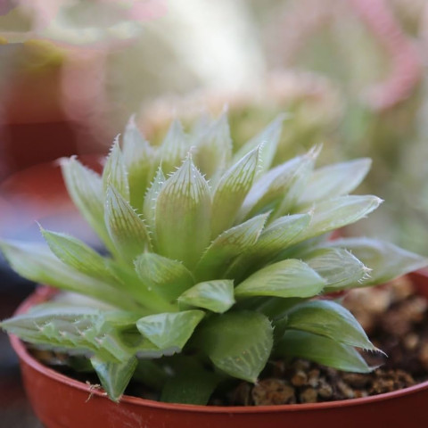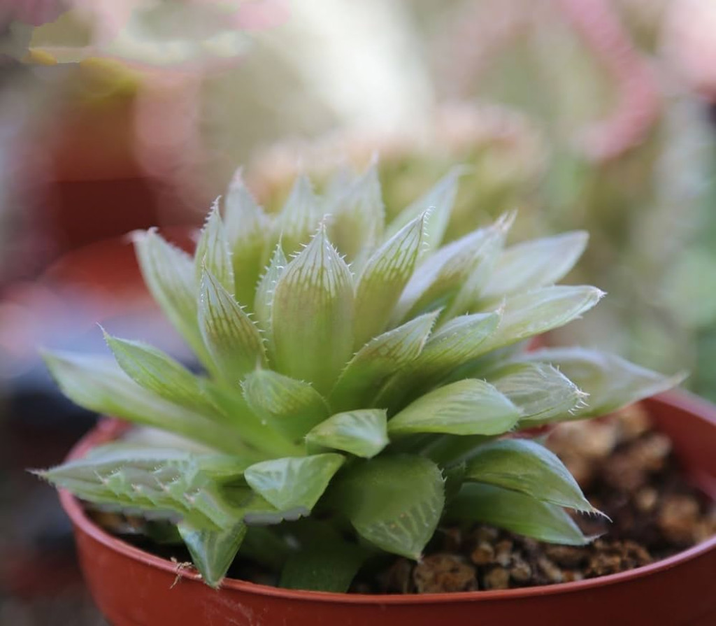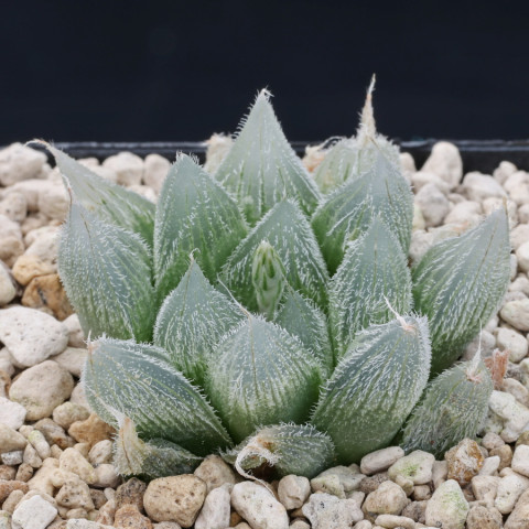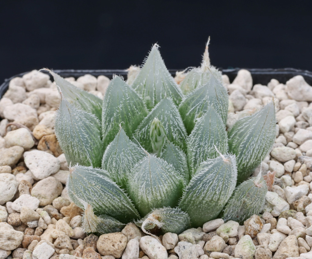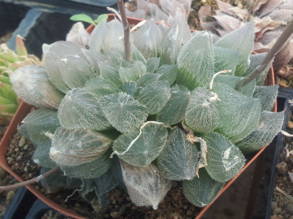 Haworthia cooperi var. venusta, yoğun beyaz tüylerle kaplı yaprak yüzeyi, yumuşak mat görünümü, yarı saydam pencere dokuları ve sık yavrulanan kompakt rozet yapısıyla Haworthia grubunun en dikkat çekici varyetelerinden biridir. Klasik cooperi formlarında camı andıran şeffaf yaprak uçları öne çıkarken, bu varyetede yaprakların üzerini kaplayan ince beyaz tüy tabakası bitkiye kadifemsi ve sisli bir görünüm kazandırır. Yapraklar ışığa göre açık yeşilden gri-yeşile kadar değişebilir. Sağlıklı bireylerde rozet sıkı, yapraklar dolgun ve yüzeydeki tüylenme belirgin olur. Zamanla kümeler oluşturarak geniş koloniler haline gelebilir. Koleksiyoncular tarafından özellikle yoğun tüylenme, kompakt form ve berrak pencere desenleri nedeniyle tercih edilir. Doğru bakım koşullarında hem görsel olarak çok etkileyici hem de uzun ömürlü bir türdür.