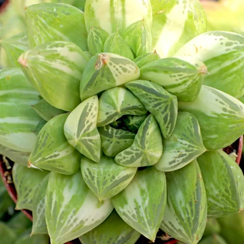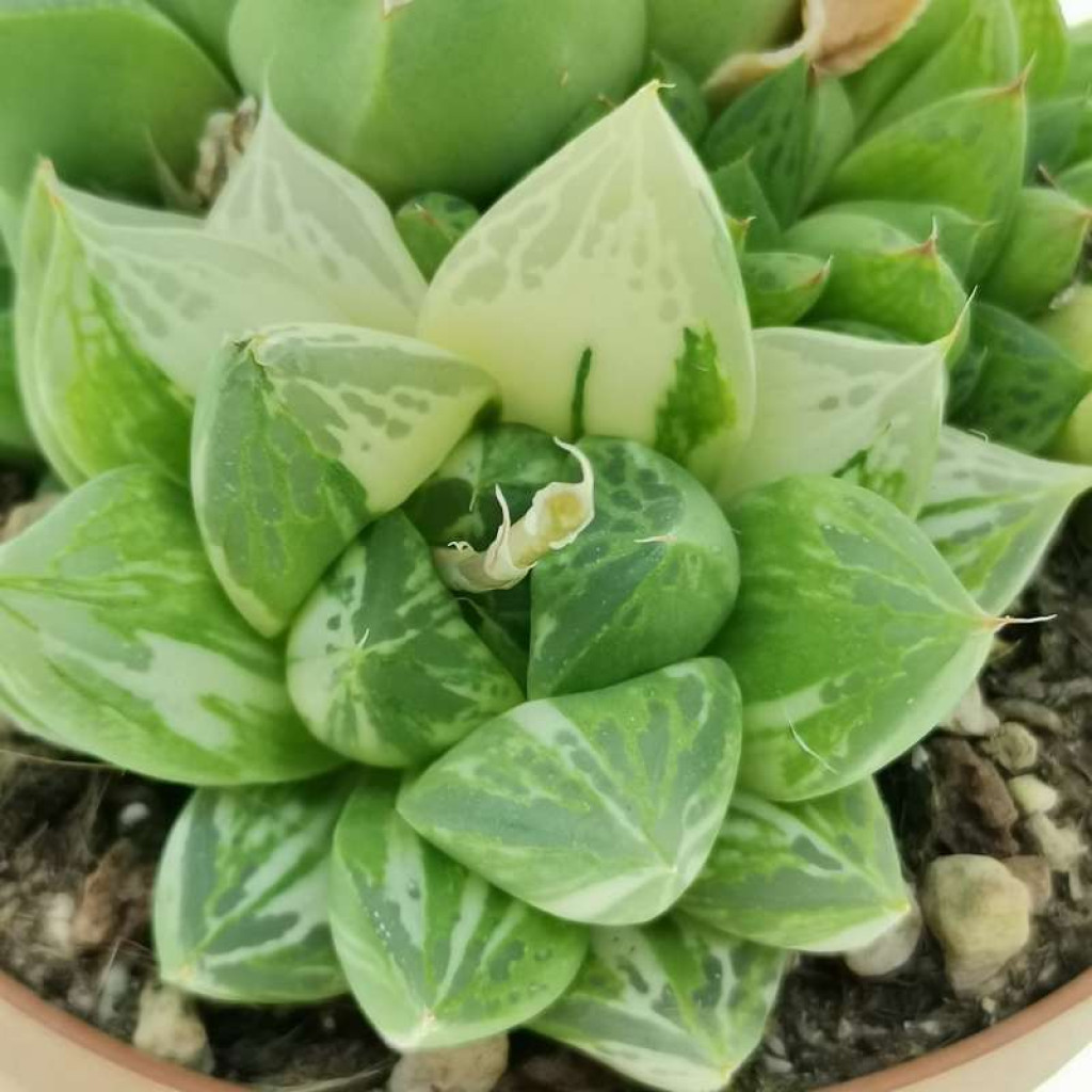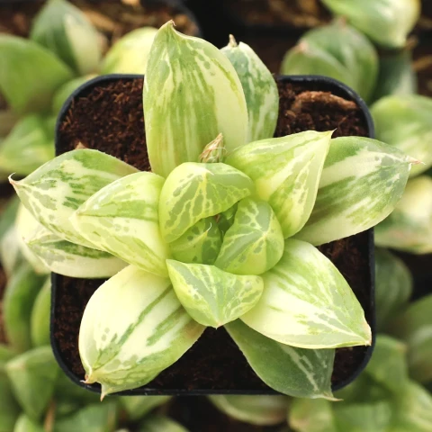 Haworthia cuspidata f. variegata, klasik Haworthia cuspidata formunun alacalı yaprak desenleriyle öne çıkan özel bir varyasyonudur. Yapraklarda yeşil ile krem, açık sarı veya beyaza yakın tonların birlikte görülmesi bu bitkiyi koleksiyoncular arasında oldukça popüler hale getirir. Kompakt rozet yapısı, pencere dokulu yaprak uçları ve dengeli büyüme formu sayesinde küçük saksılarda bile dikkat çekici bir görünüm sunar. Variegata formlar, standart yeşil bireylere göre biraz daha hassas olabilir; bu nedenle bakımında ışık, sulama ve sıcaklık dengesi daha önemlidir. Bu formun en belirgin özelliği yaprak yüzeyindeki düzensiz renk dağılımıdır. Bazı yapraklarda yarım alacalanma görülürken bazı yapraklar neredeyse tamamen açık renkli olabilir. Yapraklar etli, sivri uçlu ve rozet şeklinde dizilir. Uç kısımlardaki yarı saydam pencere bölgeleri ışığın iç dokulara ulaşmasına yardımcı olur. Açık renkli alanlar klorofil bakımından daha zayıf olduğu için bitki büyümesi standart forma göre daha yavaş gerçekleşebilir. Bu durum normaldir. Sağlıklı bir bireyde yapraklar sert, dolgun ve parlak görünür.