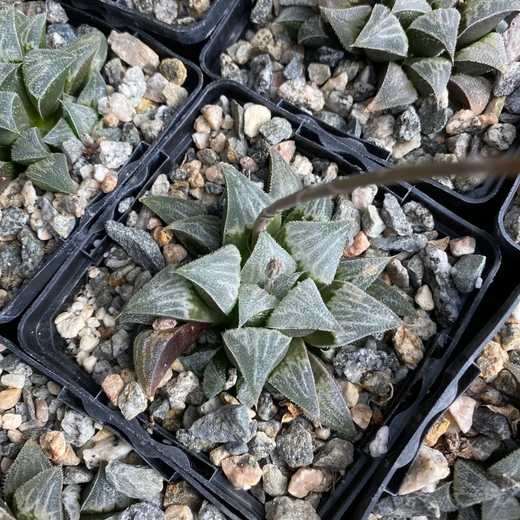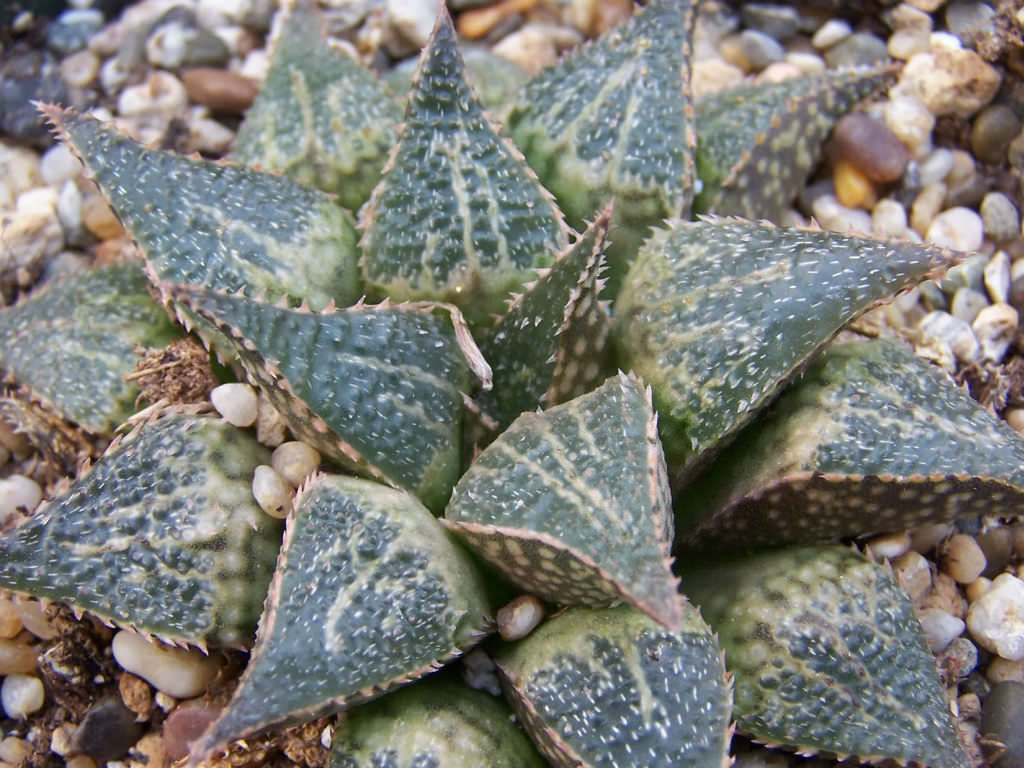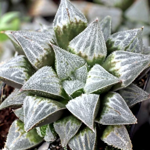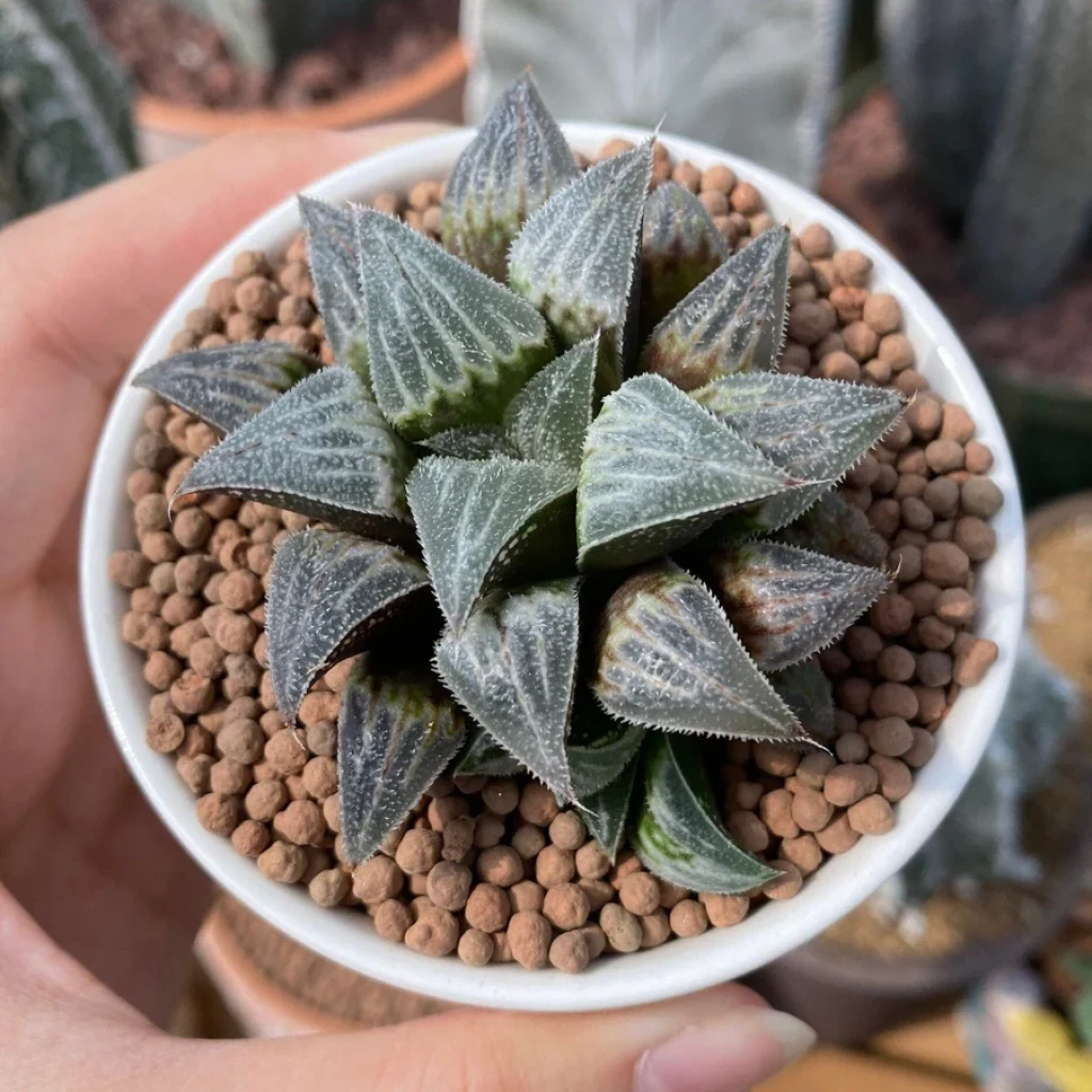 Bu varyetenin en dikkat çekici bölümü yaprak yapısıdır. Yapraklar üçgen formda, kalın dokulu ve oldukça sert yapıdadır. Uç kısımlar sivri şekilde sonlanır, ancak genel görünüm ince değil güçlü ve etlidir. Yaprak yüzeyinde çok sayıda küçük beyaz benek, kabarcık benzeri doku ve pütürlü bir kaplama görülür. Bu doku bitkiye mat ve heykelsi bir görünüm kazandırır. Yaprakların üst kısımlarında yarı saydam pencere bölgeleri bulunabilir. Bu alanlarda çizgisel desenler, damar benzeri hatlar veya açık renkli şeritler ortaya çıkar. Her bireyde desen yoğunluğu farklı olabilir; bazı örneklerde yoğun beyaz yüzey hakimken bazı bireylerde koyu yeşil tonlar daha baskındır. Renk skalası oldukça değişkendir. Sağlıklı bitkilerde gri-yeşil, koyu zeytin yeşili, maviye çalan yeşil veya gümüşü tonlar görülebilir. Aydınlık koşullarda beyaz benekler ve kabartılar daha net ortaya çıkar. Serin mevsimlerde veya ışık şiddeti arttığında yaprak uçlarında hafif pembemsi, kahverengimsi ya da bronz geçişler oluşabilir. Bu değişimler çoğu zaman çevresel tepkidir ve bitkinin görsel karakterine katkı sağlar. Ancak renk solması, aşırı sararma veya doku yumuşaması gibi belirtiler bakım dengesinin bozulduğunu gösterebilir.