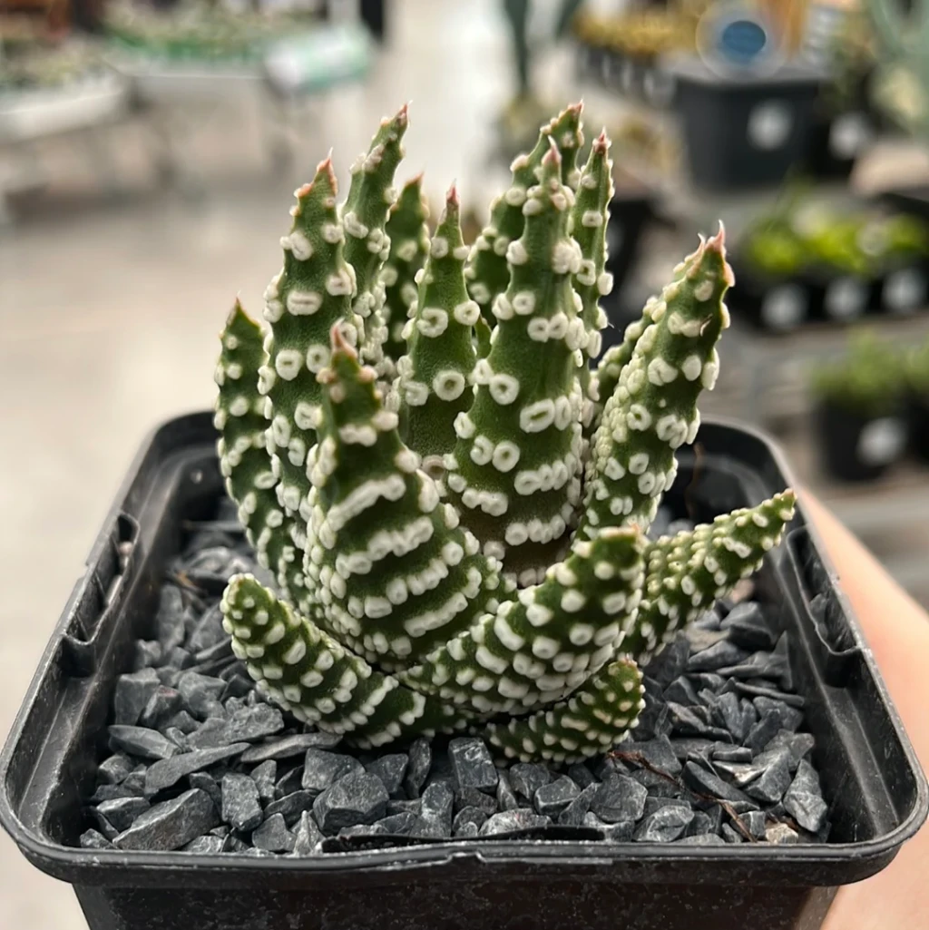 Haworthia pumila 'Donuts', kalın ve sert yaprakları üzerinde görülen belirgin yuvarlak kabartılarıyla tanınan özel bir Haworthia pumila kültivarıdır. Adındaki “Donuts” ifadesi, yaprak yüzeyindeki halka biçimli, yuvarlak veya kabarık beyaz çıkıntıların oluşturduğu görünüme gönderme yapar. Bu kültivar, klasik Haworthia pumila formlarındaki beyaz kabartılı yapıyı daha iri, daha yuvarlak ve daha belirgin desenlerle taşır. Yapraklar koyu yeşil zemin üzerinde gelişir ve yüzeydeki kabartılar bitkiye güçlü bir doku kazandırır. Genç bireylerde rozet daha sıkı ve dik görünümlüdür; olgunlaştıkça yapraklar daha güçlü, daha geniş ve daha katmanlı hale gelir. Gelişim hızı genellikle yavaştır. Bu nedenle bakımda hızlı büyüme beklentisi yerine yaprak dokusunun korunması, kök sağlığının desteklenmesi ve rozet formunun dengeli gelişmesi hedeflenmelidir.